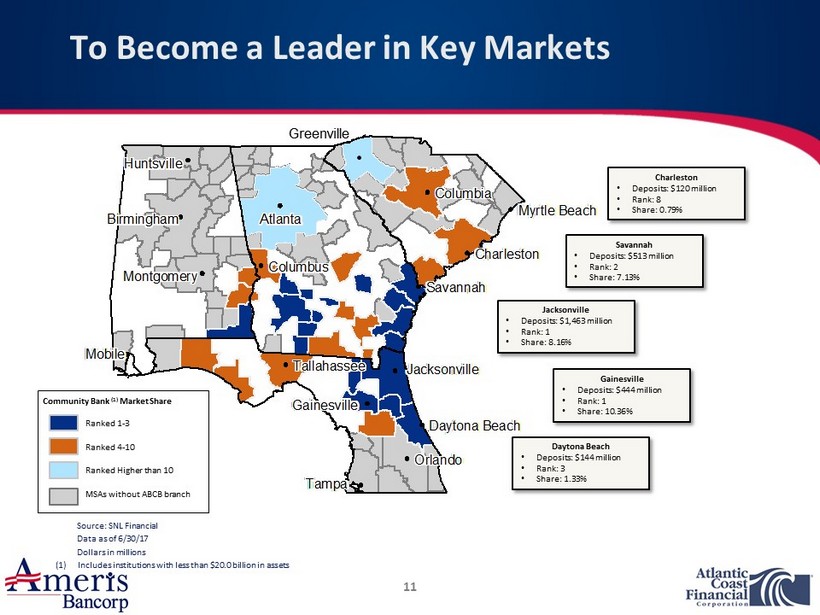 And in Florida… 10 Deposits by State ($mm) ABCB Historical (1) Pro Forma Today (2) GA $1,719 66% FL $393 15% SC $278 11% AL $198 8% GA $2,837 49% FL $2,275 39% SC $506 9% AL $180 3% GA $3,074 47% FL $2,728 42% SC $506 8% AL $180 3% Source: SNL Financial (1) Historical data as of the quarter prior to acquisition of Prosperity Banking Company (2) Data as of 6/30/17 • ABCB executives work and live in Jacksonville • 4 th Acquisition in Florida over the last 4 years