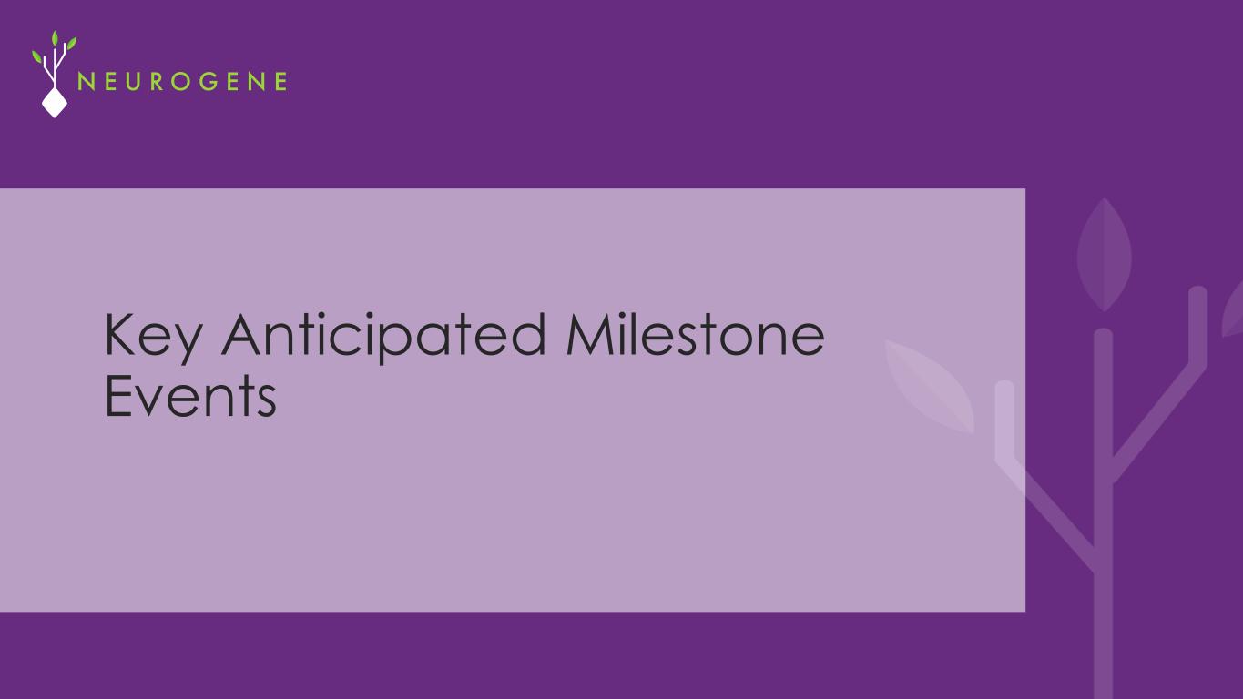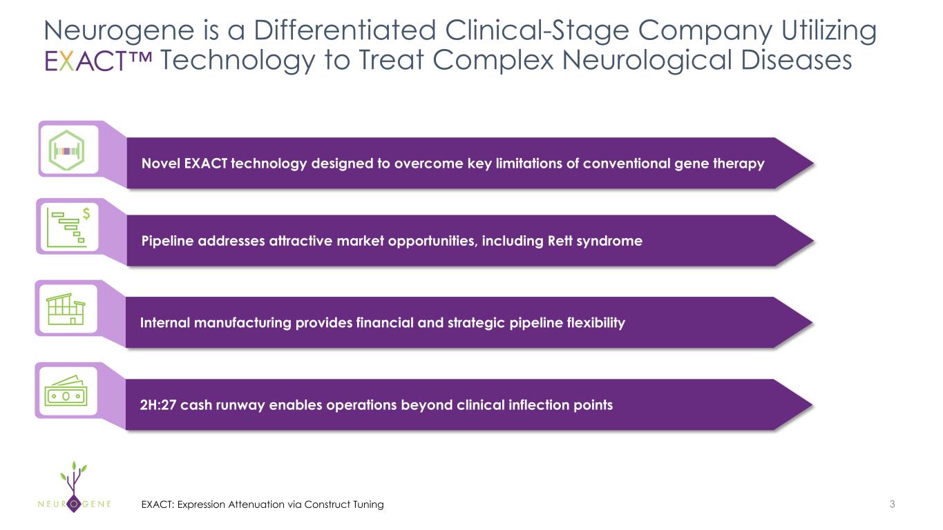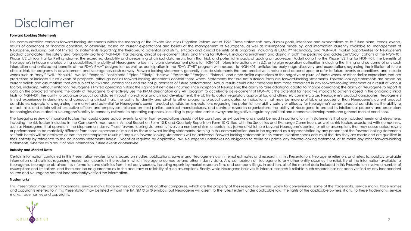 2 Disclaimer  Forward Looking Statements This communication contains forward-looking statements within the meaning of the Private Securities Litigation Reform Act of 1995. These statements may discuss goals, intentions and expectations as to future plans, trends, events,  results of operations or financial condition, or otherwise, based on current expectations and beliefs of the management of Neurogene, as well as assumptions made by, and information currently available to, management of  Neurogene, including, but not limited to, statements regarding: the therapeutic potential and utility, efficacy and clinical benefits of its programs, including its EXACTTM technology and NGN-401; market opportunities for Neurogene's  product candidates; the safety and tolerability profile of NGN-401; trial designs, clinical development plans and timing for NGN-401, including enrollment and dosing in both the pediatric and adolescent/adult cohorts of the NGN-401  Phase 1/2 clinical trial for Rett syndrome, the expected durability and deepening of clinical data results from that trial, and potential impacts of adding an adolescent/adult cohort to the Phase 1/2 trial for NGN-401; the benefits of  Neurogene's in-house manufacturing capabilities; the ability of Neurogene to identify future development plans for NGN-101; future interactions with U.S. or foreign regulatory authorities, including the timing and outcome of any such  interaction and anticipated benefits of the FDA's RMAT designation as well as participation in the FDA's START program with respect to NGN-401; anticipated early-stage discovery and expectations regarding the initiation of future  clinical trials for programs in development; and Neurogene's cash runway. Forward-looking statements generally include statements that are predictive in nature and depend upon or refer to future events or conditions, and include  words such as “may,” “will,” “should,” “would,” “expect,” “anticipate,” “plan,” “likely,” “believe,” “estimate,” “project,” “intend,” and other similar expressions or the negative or plural of these words, or other similar expressions that are  predictions or indicate future events or prospects, although not all forward-looking statements contain these words. Statements that are not historical facts are forward-looking statements. Forward-looking statements are based on  current beliefs and assumptions that are subject to risks and uncertainties and are not guarantees of future performance. Actual results could differ materially from those contained in any forward-looking statement as a result of various  factors, including, without limitation: Neurogene’s limited operating history; the significant net losses incurred since inception of Neurogene; the ability to raise additional capital to finance operations; the ability of Neurogene to report its  data on the predicted timeline; the ability of Neurogene to effectively use the RMAT designation or START program to accelerate development of NGN-401; the potential for negative impacts to patients dosed in the ongoing clinical  trials for NGN-401; the ability to advance product candidates through non-clinical and clinical development; the ability to obtain regulatory approval for, and ultimately commercialize, Neurogene’s product candidates; Neurogene’s  limited experience in designing and conducting clinical trials; the ability to identify and pivot to other programs, product candidates, or indications that may be more profitable or successful than Neurogene’s current product  candidates; expectations regarding the market and potential for Neurogene’s current product candidates; expectations regarding the potential tolerability, safety or efficacy for Neurogene’s current product candidates; the ability to  attract, hire, and retain skilled executive officers and employees; reliance on third parties, contract manufacturers, and contract research organizations; the ability of Neurogene to protect its intellectual property and proprietary  technologies; risks related to Neurogene’s ability to correctly estimate its operating expenses, including its projected cash runway; and legislative, regulatory, political and economic developments and general market conditions. The foregoing review of important factors that could cause actual events to differ from expectations should not be construed as exhaustive and should be read in conjunction with statements that are included herein and elsewhere,  including the risk factors included in the Company’s most recent Annual Report on Form 10-K and Quarterly Reports on Form 10-Q filed with the Securities and Exchange Commission, as well as risk factors associated with companies,  such as Neurogene, that operate in the biopharma industry. These forward-looking statements involve a number of risks, uncertainties (some of which are beyond Neurogene’s control) or other assumptions that may cause actual results  or performance to be materially different from those expressed or implied by these forward-looking statements. Nothing in this communication should be regarded as a representation by any person that the forward-looking statements  set forth herein will be achieved or that the contemplated results of any such forward-looking statements will be achieved. Forward-looking statements in this communication speak only as of the day they are made and are qualified in  their entirety by reference to the cautionary statements herein. Except as required by applicable law, Neurogene undertakes no obligation to revise or update any forward-looking statement, or to make any other forward-looking  statements, whether as a result of new information, future events or otherwise. Industry and Market Data Certain information contained in this Presentation relates to or is based on studies, publications, surveys and Neurogene’s own internal estimates and research. In this Presentation, Neurogene relie