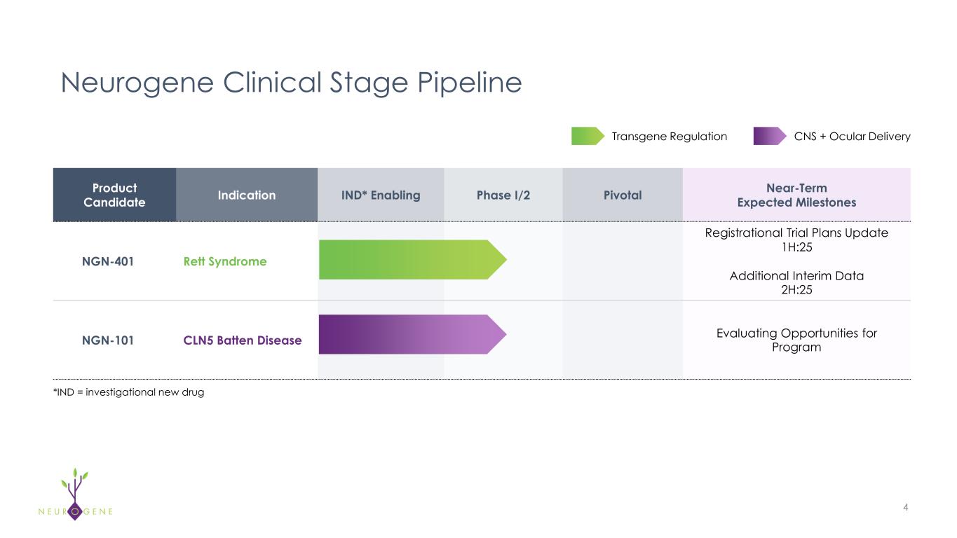 Neurogene is a Differentiated Clinical-Stage Company Utilizing  EXACT  Technology to Treat Complex Neurological Diseases 3 Novel EXACT technology designed to overcome key limitations of conventional gene therapy Internal manufacturing provides financial and strategic pipeline flexibility  Pipeline addresses attractive market opportunities, including Rett syndrome Internal manufacturing provides financial and strategic pipeline flexibility 2H:27 cash runway enables operations beyond clinical inflection points $ EXACT: Expression Attenuation via Construct Tuning
