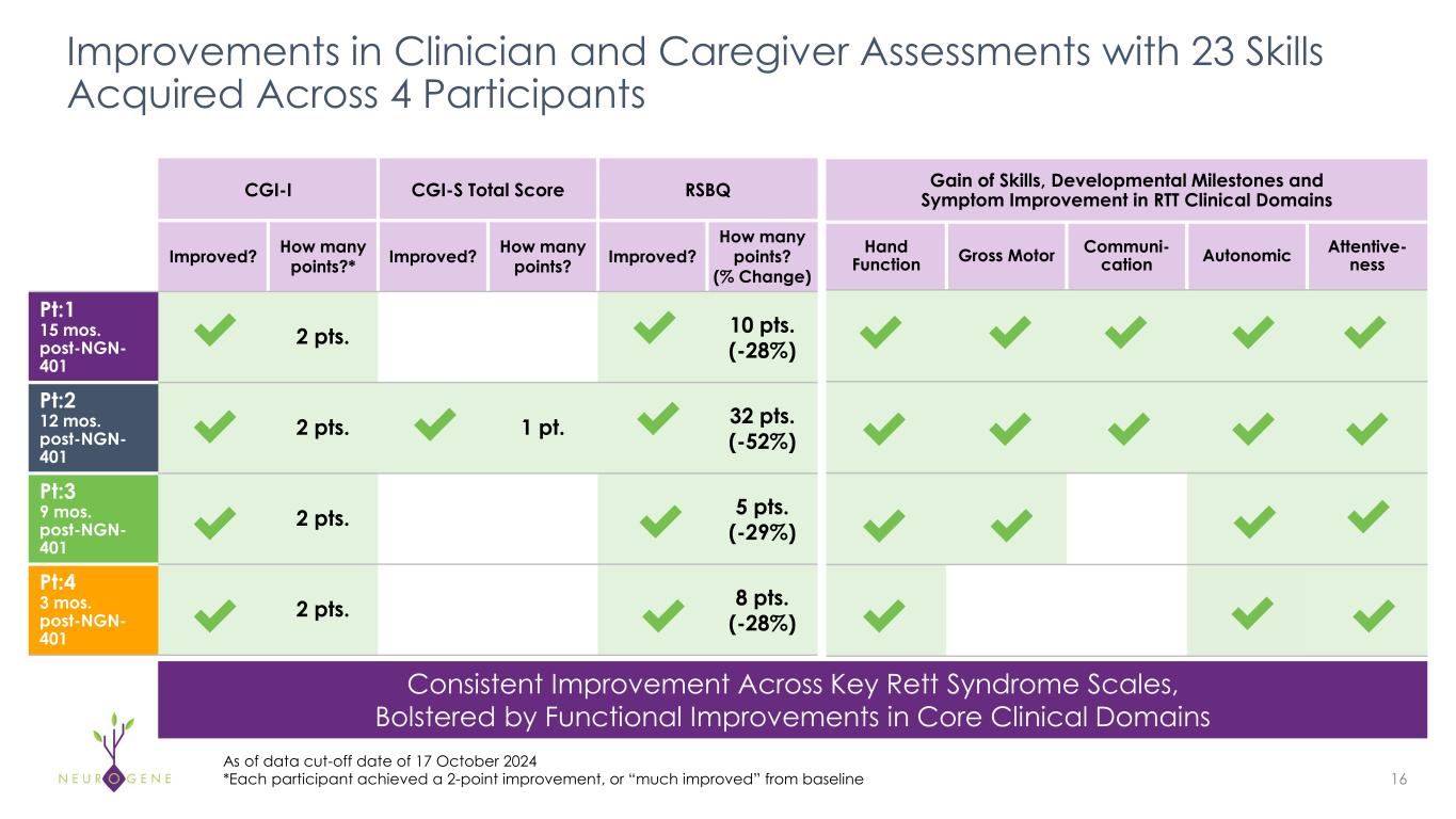 15 Baseline Characteristics Range from Moderate to Severe  Disease 1E15 vg Participant 1  (Pt:1) Participant 2  (Pt:2) Participant 3  (Pt:3) Participant 4  (Pt:4) Participant 5  (Pt:5) Age at Dosing  in Years 7 4 6 7 6 MECP2 Mutation  Severity Mild Severe Severe Severe Severe Baseline Disease  Severity as Indicated  by CGI-S Score 4  (moderately ill) 5  (markedly ill) 5  (markedly ill) 5  (markedly ill) 5  (markedly ill) Time Post Treatment  with NGN-401 in  Months ~15 ~12 ~9 <6 ~1 Despite Similar CGI-S Scores, Individual Baseline Presentations Vary Widely  Across Core Clinical Domains As of data cut-off date of 17 October 2024