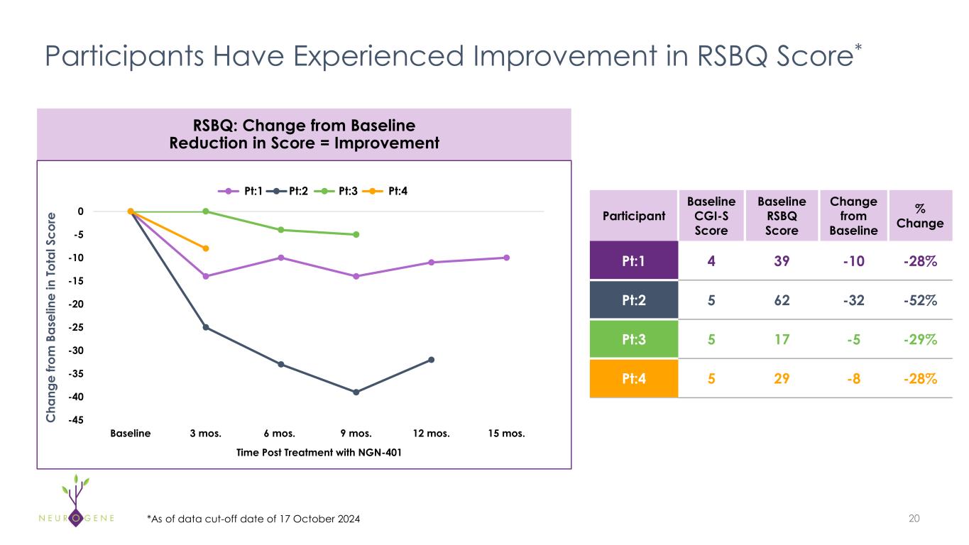 Participants Achieved CGI-I Rating of “Much Improved” CGI-I Score ≤ 3 = Clinically Meaningful Improvement Pt:1 3 – Minimally  Improved 2 – Much Improved 2 – Much Improved 2 – Much Improved 2 – Much Improved Pt:2 2 – Much Improved 2 – Much Improved 2 – Much Improved 2 – Much Improved Pt:3 3 – Minimally  Improved 3 – Minimally  Improved 2 – Much Improved Pt:4 2 – Much Improved 3 mos. 6 mos. 9 mos. 12 mos. 15 mos. 18 Post Treatment with NGN-401  *As of data cut-off date of 17 October 2024 Clinically Meaningful Improvement Observed Early After Treatment, with Deepening  Response and Durability Over Time*