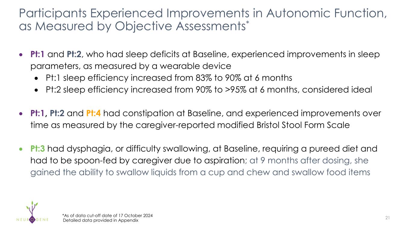Participants Experienced Improvements in Autonomic Function,  as Measured by Objective Assessments* 21Detailed data provided in Appendix • Pt:1 and Pt:2, who had sleep deficits at Baseline, experienced improvements in sleep  parameters, as measured by a wearable device • Pt:1 sleep efficiency increased from 83% to 90% at 6 months • Pt:2 sleep efficiency increased from 90% to >95% at 6 months, considered ideal • Pt:1, Pt:2 and Pt:4 had constipation at Baseline, and experienced improvements over  time as measured by the caregiver-reported modified Bristol Stool Form Scale • Pt:3 had dysphagia, or difficulty swallowing, at Baseline, requiring a pureed diet and  had to be spoon-fed by caregiver due to aspiration; at 9 months after dosing, she  gained the ability to swallow liquids from a cup and chew and swallow food items *As of data cut-off date of 17 October 2024