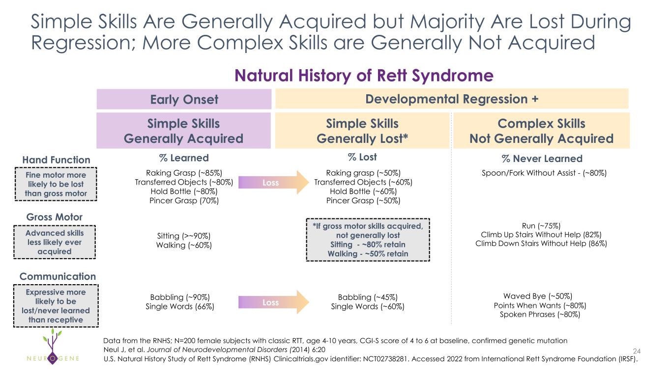 Rett Syndrome is Defined By Regression Period in Early  Development  23 Pini G, et al. Orphanet Journal of Rare Diseases (2016) 11:132. C lin ic al  fu nc tio n ~6 mos. to  ~18 mos.  ~1 to 3 years ~3 to 10 years Normal Adolescence to Adulthood Developmental  Regression Early  Onset Disease Progression“Relative Stability” Severely  Impaired Delayed  early  development • Arrested development;  can be misdiagnosed as  “developmental delay” • Loss of acquired skills,  including fine motor and  communication U.S. Natural History Study of Rett Syndrome (RNHS) Clinicaltrials.gov identifier: NCT02738281. Accessed 2022 from International Rett  Syndrome Foundation (IRSF).    Neul J, et al. Journal of Neurodevelopmental Disorders (2014) 6:20