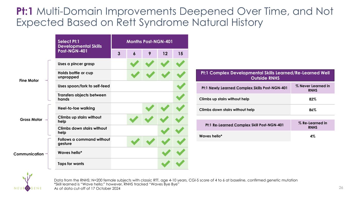 Hand Function /  Fine Motor • Had a raking grasp, briefly held  objects, dropping items quickly, with  limited ability to self-feed Ambulation /  Gross Motor • Walked independently, but would stay  on her tip-toes, freeze often and  required a parent to help her go  up/down stairs or get on/off a bed Language /  Communication • Unable to indicate her wishes, follow  simple commands from her parents, or  express emotion Pt:1 From Pre-Treatment to 15 Months Post NGN-401 25 Baseline (7 years old) Post Treatment with NGN-401 Images are representative of skills and are not photos of participants in the NGN-401 clinical trial As of data cut-off date of 17 October 2024 • Developed a pincer grasp, able to self-feed, has begun using a fork to eat; uses both  hands to drink on her own • More fluid gait with heel to toe walking, and does the following on her own: goes  up/down the stairs, climbs out of high rimmed bathtub, gets on/off furniture, climbs out  of her car seat to exit the car  • Without being told, navigates her house to the car to go to school, waves hello to her  grandfather on daily video calls, taps on food items to express choices, frowns/shouts  to show displeasure • Follows >10 commands such as “give a kiss,” “sit down,” “give it to me,” “put item in  trash,” “open/close door,” “flush toilet”