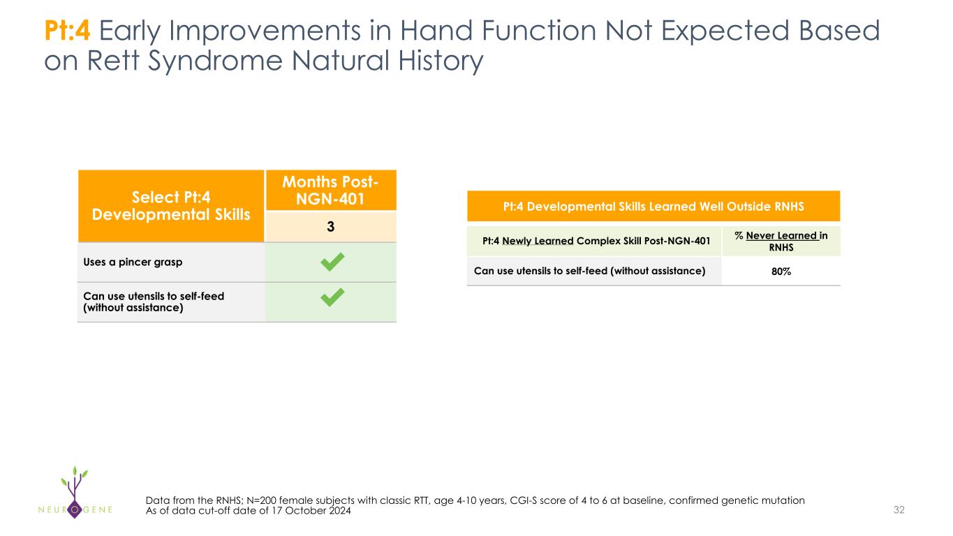 Hand Function /  Fine Motor • Raking grasp, able to use adaptive  utensils to self-feed, unable to hold or  use regular utensils Ambulation /  Gross Motor • Could not stand or walk  independently Language /  Communication • No babbling, unable to follow  commands, laughed out of context 31Images are representative of skills and are not photos of participants in the NGN-401 clinical trial As of data cut-off date of 17 October 2024 • Able to use regular utensils to self-feed, reaches with more precision • No substantial improvement observed yet at 3 months post treatment with NGN-401 • Laughs at appropriate moments while watching favorite movie or listening to an audio  program • Vocalizes to express discomfort or show emotion Pt:4 From Pre-Treatment to 3 Months Post NGN-401 Baseline (7 years old) Post Treatment with NGN-401