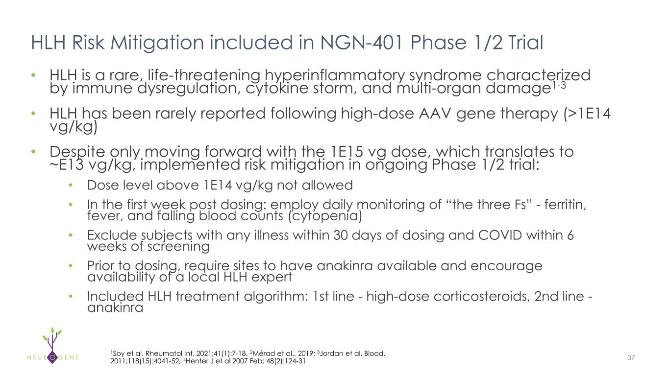 HLH Risk Mitigation included in NGN-401 Phase 1/2 Trial • HLH is a rare, life-threatening hyperinflammatory syndrome characterized  by immune dysregulation, cytokine storm, and multi-organ damage1-3 • HLH has been rarely reported following high-dose AAV gene therapy (>1E14  vg/kg) • Despite only moving forward with the 1E15 vg dose, which translates to  ~E13 vg/kg, implemented risk mitigation in ongoing Phase 1/2 trial: • Dose level above 1E14 vg/kg not allowed • In the first week post dosing: employ daily monitoring of “the three Fs” - ferritin,  fever, and falling blood counts (cytopenia) • Exclude subjects with any illness within 30 days of dosing and COVID within 6  weeks of screening • Prior to dosing, require sites to have anakinra available and encourage  availability of a local HLH expert  • Included HLH treatment algorithm: 1st line - high-dose corticosteroids, 2nd line -   anakinra 37 1Soy et al. Rheumatol Int. 2021;41(1):7-18. 2Mérad et al., 2019; 3Jordan et al. Blood.  2011;118(15):4041-52; 4Henter J et al 2007 Feb; 48(2):124-31