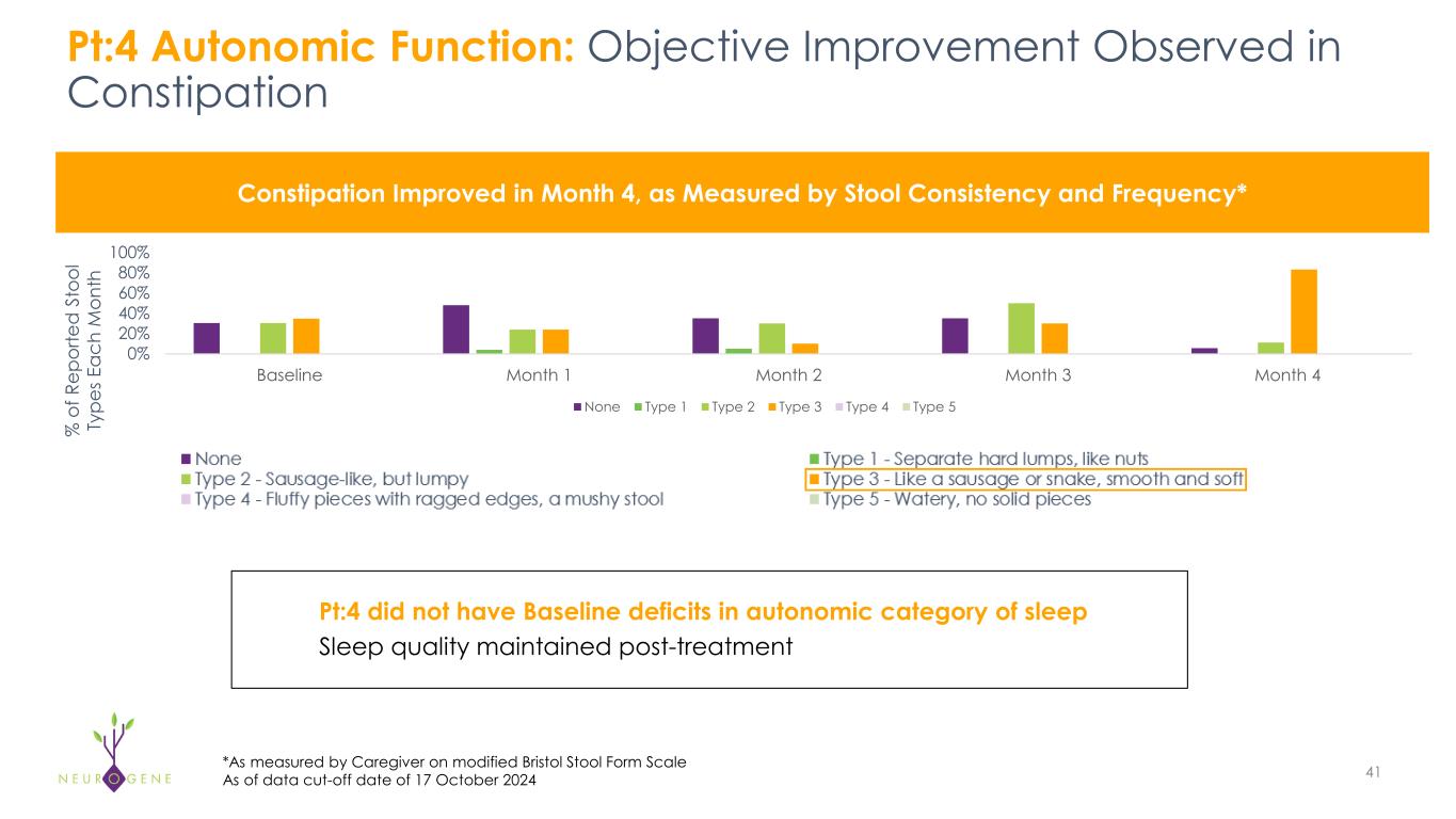 Pt:1 Autonomic Function: Objective Improvements Observed in  Sleep Parameters and Constipation 38 Total sleep  time increased  from 6.6 to 7  hrs./night  Number of  position  changes  decreased  from 37 to 18  per night Sleep  efficiency*  increased from  83% to ~90%  (95% is ideal) Improvements in All Sleep Parameters, as Assessed by Wearable Device Constipation Improved Over Time, as Measured by Stool Consistency and Frequency** %  o f R ep or te d  S to ol   Ty pe s E ac h  M on th 0% 20% 40% 60% 80% 100% Month 0 Month 1 Month 2 Month 3 Month 4 Month 5 Month 6 None Type 1 - Separate hard lumps, like nuts Type 2 - Sausage-like, but lumpy Type 3 - Like a sausage or snake, smooth and soft Type 4 - Fluffy pieces with ragged edges, a mushy stool Type 5 - Watery, no solid pieces Baseline BL 3M 6M 9M 12M 4 6 8 10 12 To ta l S le ep  T im e  (h r) BL 3M 6M 9M 12M 0 20 40 60 80 100 120 #  Sl ee p  Po si tio n C ha ng es BL 3M 6M 9M 12M 70 80 90 100 Sl ee p  Ef fic ie nc y  (% ) *Sleep efficiency defined as time spent asleep vs. total time spent in bed **As measured by Caregiver on modified Bristol Stool Form Scale As of data cut-off date of 17 October 2024