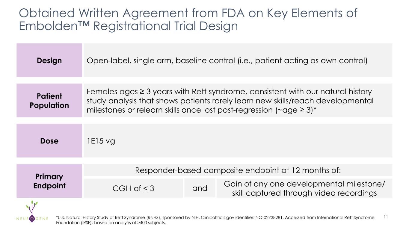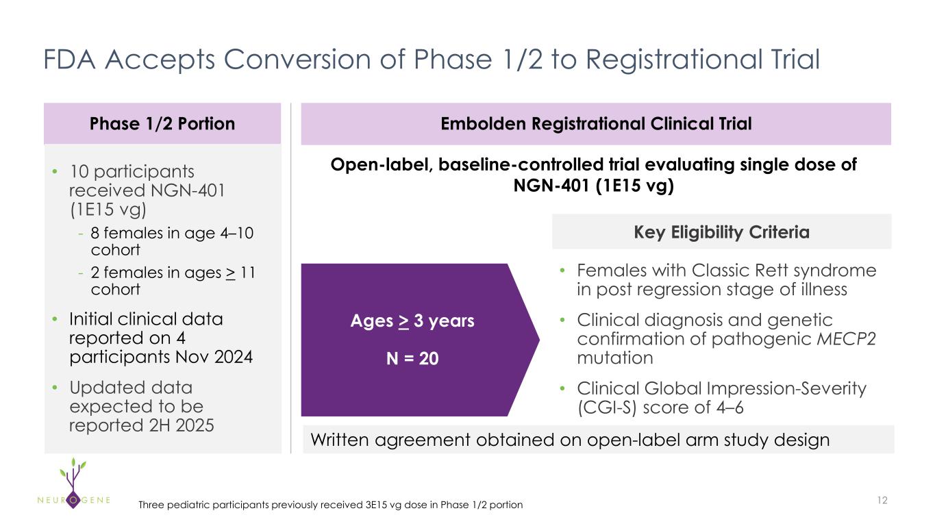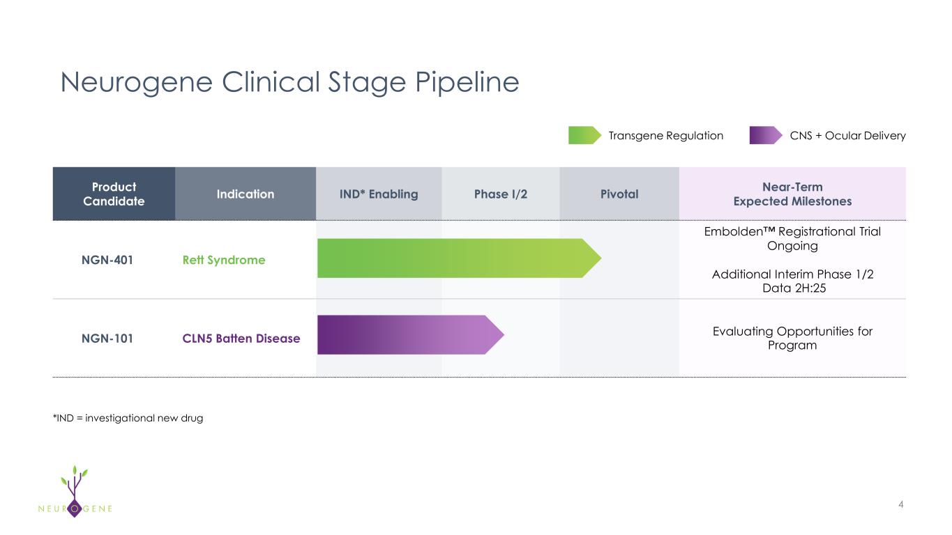 Neurogene: Developing Life-Changing Genetic Medicines For Rare Neurological Diseases 3EXACT: Expression Attenuation via Construct Tuning Lead program NGN-401 for Rett syndrome demonstrated promising interim clinical data Embolden registrational trial ongoing with first participant dosed in 4Q:25; enrollment expected to complete in 3-6 months Rett syndrome represents an attractive commercial opportunity with substantial unmet need NGN-401 uses EXACT , a proprietary transgene regulation technology to overcome a key limitation in gene therapy Internal manufacturing capabilities provide strategic flexibility Cash runway expected to fund operations into early 2028