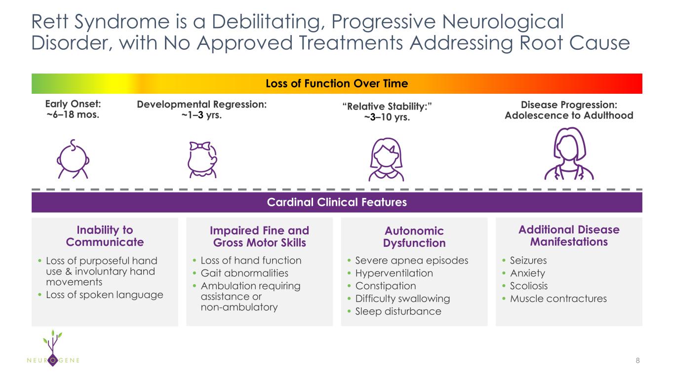 Rett Syndrome – Devastating Disorder with High Unmet Need 7 Genetics • X-Linked disorder causing mutations in the gene encoding for methyl-CpG binding protein 2 (MeCP2) • Unknown incidence in boys, but typically lethal by ~3 years of age due to no healthy copy of MeCP2 U.S. prevalence estimate based on published incidence rates; Laurvick CL, et al. J Pediatr 2006;148(3):347–35. WW incidence estimate based on published incidence rates; Pini G, et al. Orphanet Journal of Rare Diseases (2016) 11:132. High Unmet Need • There are no approved treatments that address root cause of disease • Significant unmet need remains for new treatment options Compelling Market Opportunity • U.S. prevalence - ~6,000-9,000 patients • WW incidence - 1:10,000 females