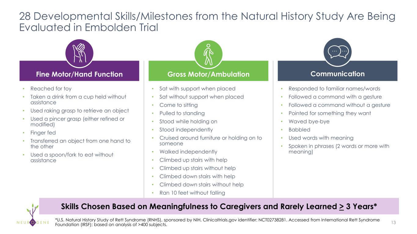 FDA Accepts Conversion of Phase 1/2 to Registrational Trial 12Three pediatric participants previously received 3E15 vg dose in Phase 1/2 portion Open-label, baseline-controlled trial evaluating single dose of NGN-401 (1E15 vg) Embolden Registrational Clinical Trial Ages > 3 years N = 20 Phase 1/2 Portion • Females with Classic Rett syndrome in post regression stage of illness • Clinical diagnosis and genetic confirmation of pathogenic MECP2 mutation • Clinical Global Impression-Severity (CGI-S) score of 4–6 Key Eligibility Criteria Written agreement obtained on open-label arm study design • 10 participants received NGN-401 (1E15 vg) - 8 females in age 4–10 cohort - 2 females in ages > 11 cohort • Initial clinical data reported on 4 participants Nov 2024 • Updated data expected to be reported 2H 2025