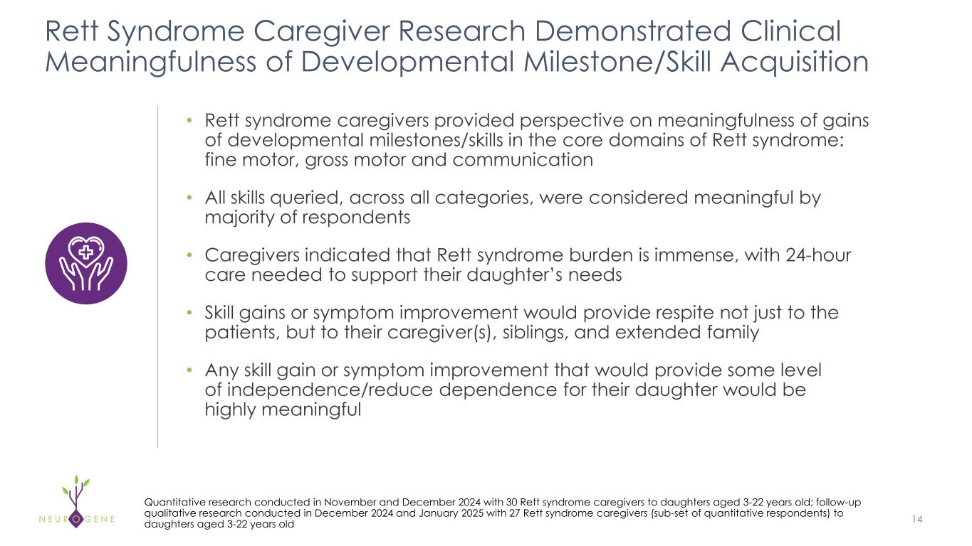 • Rett syndrome caregivers provided perspective on meaningfulness of gains of developmental milestones/skills in the core domains of Rett syndrome: fine motor, gross motor and communication • All skills queried, across all categories, were considered meaningful by majority of respondents • Caregivers indicated that Rett syndrome burden is immense, with 24-hour care needed to support their daughter’s needs • Skill gains or symptom improvement would provide respite not just to the patients, but to their caregiver(s), siblings, and extended family • Any skill gain or symptom improvement that would provide some level of independence/reduce dependence for their daughter would be highly meaningful 14 Quantitative research conducted in November and December 2024 with 30 Rett syndrome caregivers to daughters aged 3-22 years old; follow-up qualitative research conducted in December 2024 and January 2025 with 27 Rett syndrome caregivers (sub-set of quantitative respondents) to daughters aged 3-22 years old Rett Syndrome Caregiver Research Demonstrated Clinical Meaningfulness of Developmental Milestone/Skill Acquisition