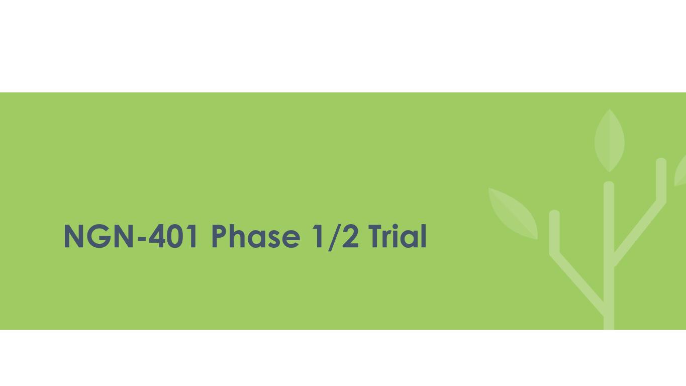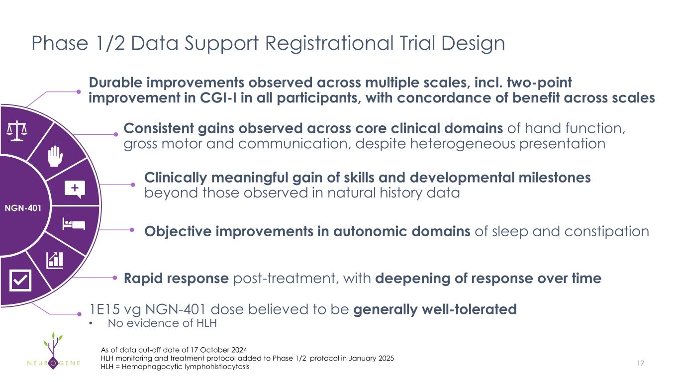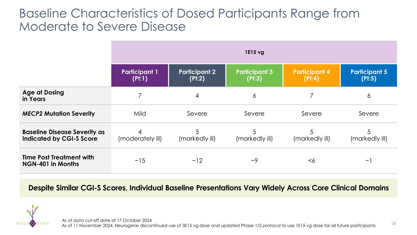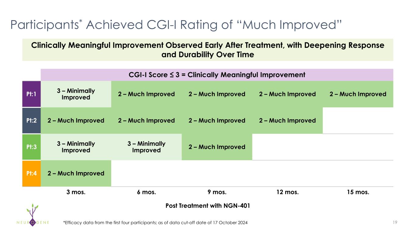 Participants* Achieved CGI-I Rating of “Much Improved” CGI-I Score ≤ 3 = Clinically Meaningful Improvement Pt:1 3 – Minimally Improved 2 – Much Improved 2 – Much Improved 2 – Much Improved 2 – Much Improved Pt:2 2 – Much Improved 2 – Much Improved 2 – Much Improved 2 – Much Improved Pt:3 3 – Minimally Improved 3 – Minimally Improved 2 – Much Improved Pt:4 2 – Much Improved 3 mos. 6 mos. 9 mos. 12 mos. 15 mos. 19 Post Treatment with NGN-401 *Efficacy data from the first four participants; as of data cut-off date of 17 October 2024 Clinically Meaningful Improvement Observed Early After Treatment, with Deepening Response and Durability Over Time