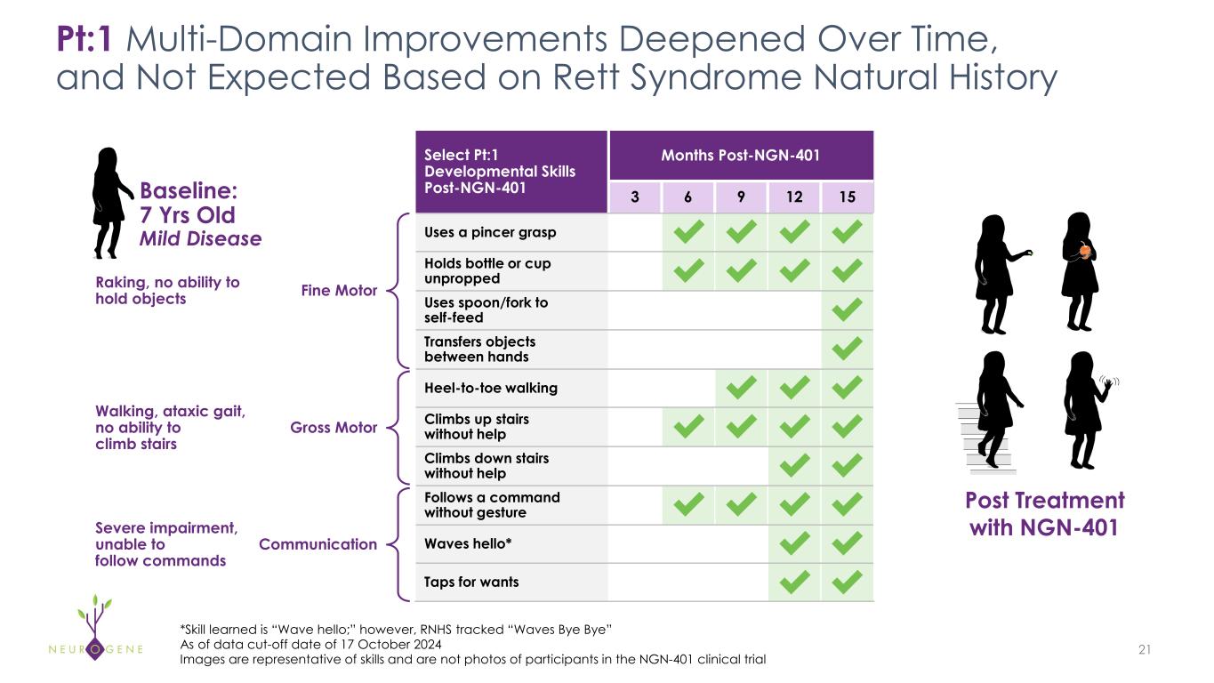 Improvements in Clinician and Caregiver Assessments with Aggregate 23 Skills Acquired Across 4 Participants 20*Each participant achieved a 2-point improvement, or “much improved” from baseline CGI-I CGI-S Total Score RSBQ Improved? How many points?* Improved? How many points? Improved? How many points? (% Change) Pt:1 15 mos. post-NGN- 401 2 pts. 10 pts. (-28%) Pt:2 12 mos. post-NGN- 401 2 pts. 1 pt. 32 pts. (-52%) Pt:3 9 mos. post-NGN- 401 2 pts. 5 pts. (-29%) Pt:4 3 mos. post-NGN- 401 2 pts. 8 pts. (-28%) Gain of Skills, Developmental Milestones and Symptom Improvement in RTT Clinical Domains Hand Function Gross Motor Communi- cation Autonomic Attentive- ness Consistent Improvement Across Key Rett Syndrome Scales, Bolstered by Functional Improvements in Core Clinical Domains Efficacy data from the first four participants; as of data cut-off date of 17 October 2024