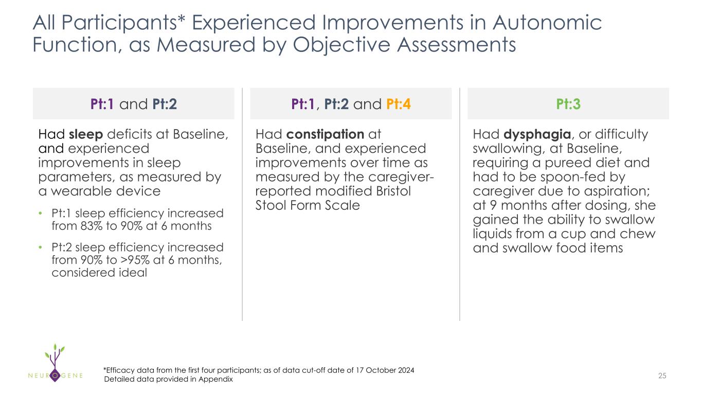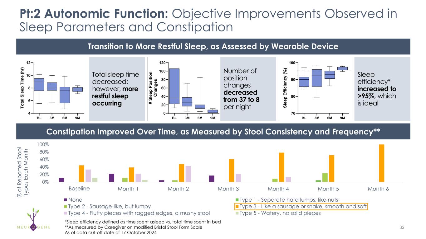 Pt:1 Autonomic Function: Objective Improvements Observed in Sleep Parameters and Constipation 31 Total sleep time increased from 6.6 to 7 hrs./night Number of position changes decreased from 37 to 18 per night Sleep efficiency* increased from 83% to ~90% (95% is ideal) Improvements in All Sleep Parameters, as Assessed by Wearable Device Constipation Improved Over Time, as Measured by Stool Consistency and Frequency** % o f R ep or te d S to ol Ty pe s E ac h M on th 0% 20% 40% 60% 80% 100% Month 0 Month 1 Month 2 Month 3 Month 4 Month 5 Month 6 None Type 1 - Separate hard lumps, like nuts Type 2 - Sausage-like, but lumpy Type 3 - Like a sausage or snake, smooth and soft Type 4 - Fluffy pieces with ragged edges, a mushy stool Type 5 - Watery, no solid pieces Baseline BL 3M 6M 9M 12M 4 6 8 10 12 To ta l S le ep T im e (h r) BL 3M 6M 9M 12M 0 20 40 60 80 100 120 # Sl ee p Po si tio n C ha ng es BL 3M 6M 9M 12M 70 80 90 100 Sl ee p Ef fic ie nc y (% ) *Sleep efficiency defined as time spent asleep vs. total time spent in bed **As measured by Caregiver on modified Bristol Stool Form Scale As of data cut-off date of 17 October 2024