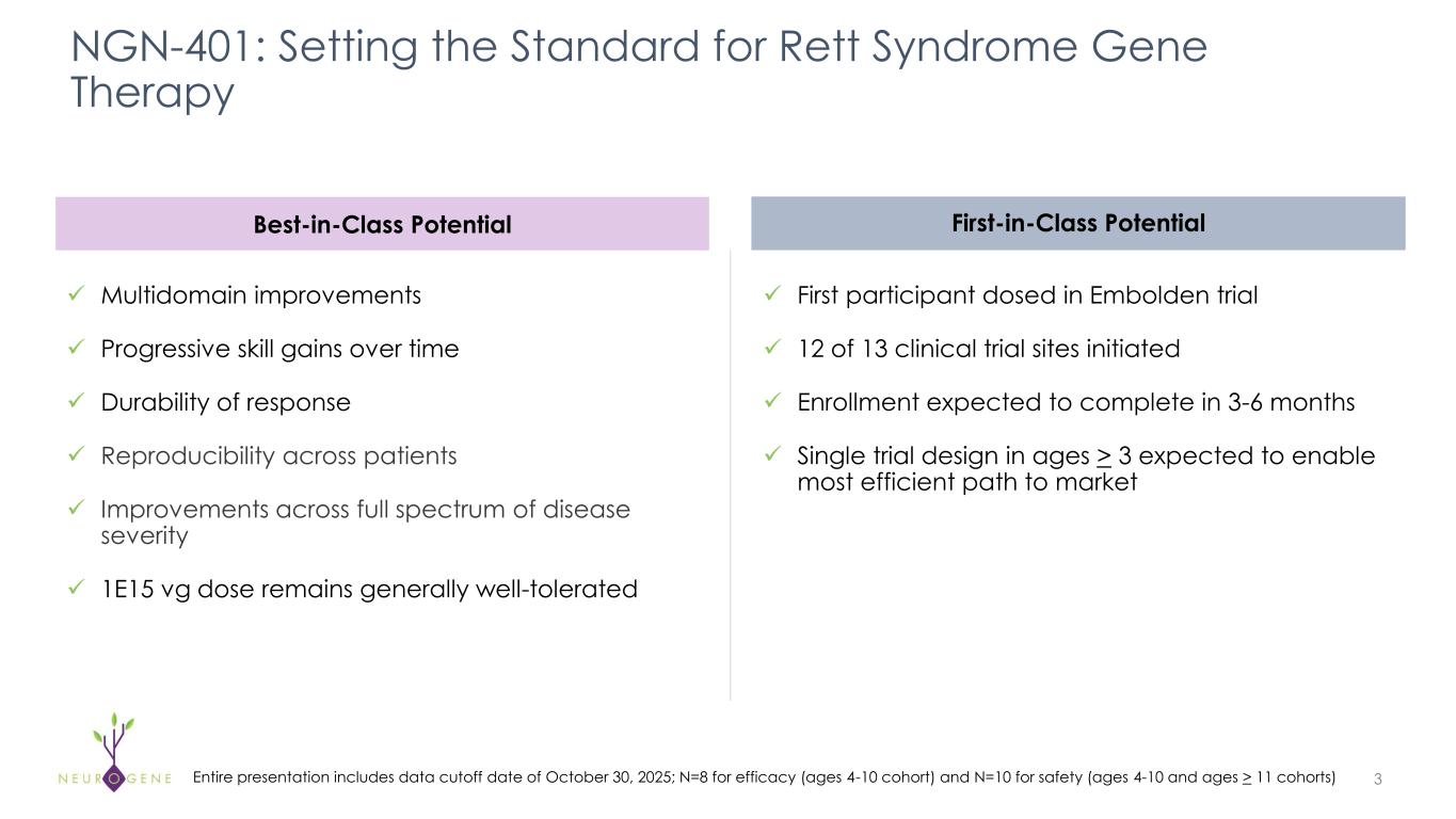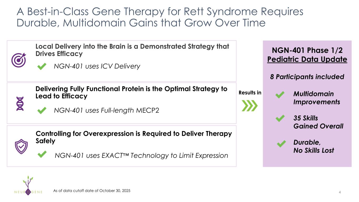 NGN-401: Setting the Standard for Rett Syndrome Gene Therapy 3Entire presentation includes data cutoff date of October 30, 2025; N=8 for efficacy (ages 4-10 cohort) and N=10 for safety (ages 4-10 and ages > 11 cohorts) ✓ Multidomain improvements ✓ Progressive skill gains over time ✓ Durability of response ✓ Reproducibility across patients ✓ Improvements across full spectrum of disease severity ✓ 1E15 vg dose remains generally well-tolerated Best-in-Class Potential First-in-Class Potential ✓ First participant dosed in Embolden trial ✓ 12 of 13 clinical trial sites initiated ✓ Enrollment expected to complete in 3-6 months ✓ Single trial design in ages > 3 expected to enable most efficient path to market