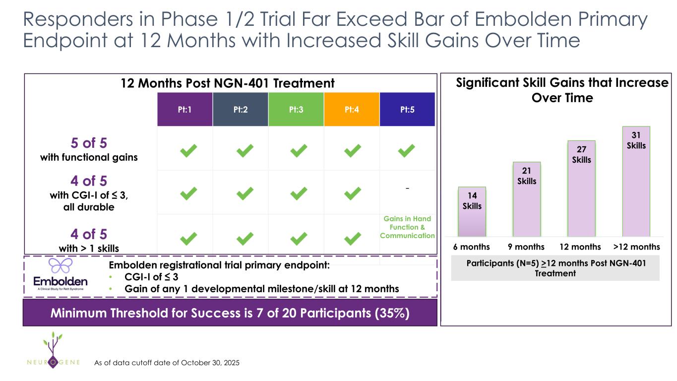 As of data cutoff date of October 30, 2025 Responders in Phase 1/2 Trial Far Exceed Bar of Embolden Primary Endpoint at 12 Months with Increased Skill Gains Over Time Pt:1 Pt:2 Pt:3 Pt:4 Pt:5 5 of 5 with functional gains 4 of 5 with CGI-I of ≤ 3, all durable - 4 of 5 with > 1 skills Gains in Hand Function & Communication Embolden registrational trial primary endpoint: • CGI-I of ≤ 3 • Gain of any 1 developmental milestone/skill at 12 months 12 Months Post NGN-401 Treatment 14 Skills 21 Skills 27 Skills 31 Skills 6 9 12 >12 Participants (N=5) >12 months Post NGN-401 Treatment Significant Skill Gains that Increase Over Time Minimum Threshold for Success is 7 of 20 Participants (35%) 6 months 9 months 12 months >12 months