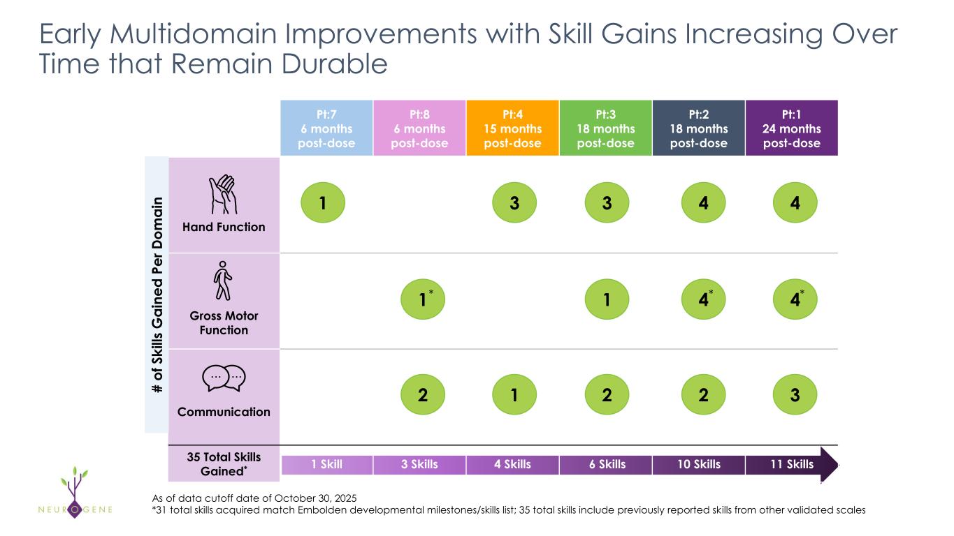 Pt:7 6 months post-dose Pt:8 6 months post-dose Pt:4 15 months post-dose Pt:3 18 months post-dose Pt:2 18 months post-dose Pt:1 24 months post-dose Hand Function Gross Motor Function Communication 35 Total Skills Gained* 1 Skill 3 Skills 4 Skills 6 Skills 10 Skills 11 Skills Early Multidomain Improvements with Skill Gains Increasing Over Time that Remain Durable # o f S k il ls G a in e d P e r D o m a in 4 4 4 4331 1 2 3212 1 As of data cutoff date of October 30, 2025 *31 total skills acquired match Embolden developmental milestones/skills list; 35 total skills include previously reported skills from other validated scales * **