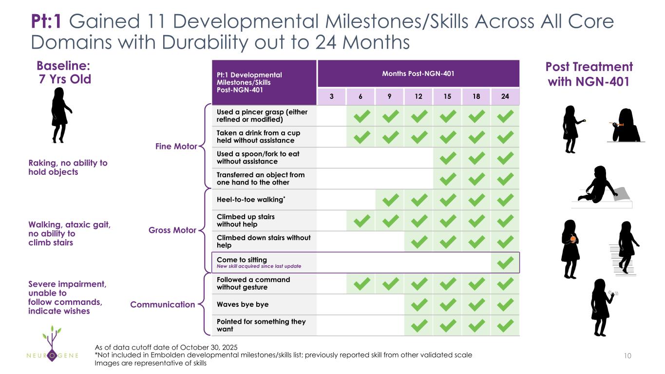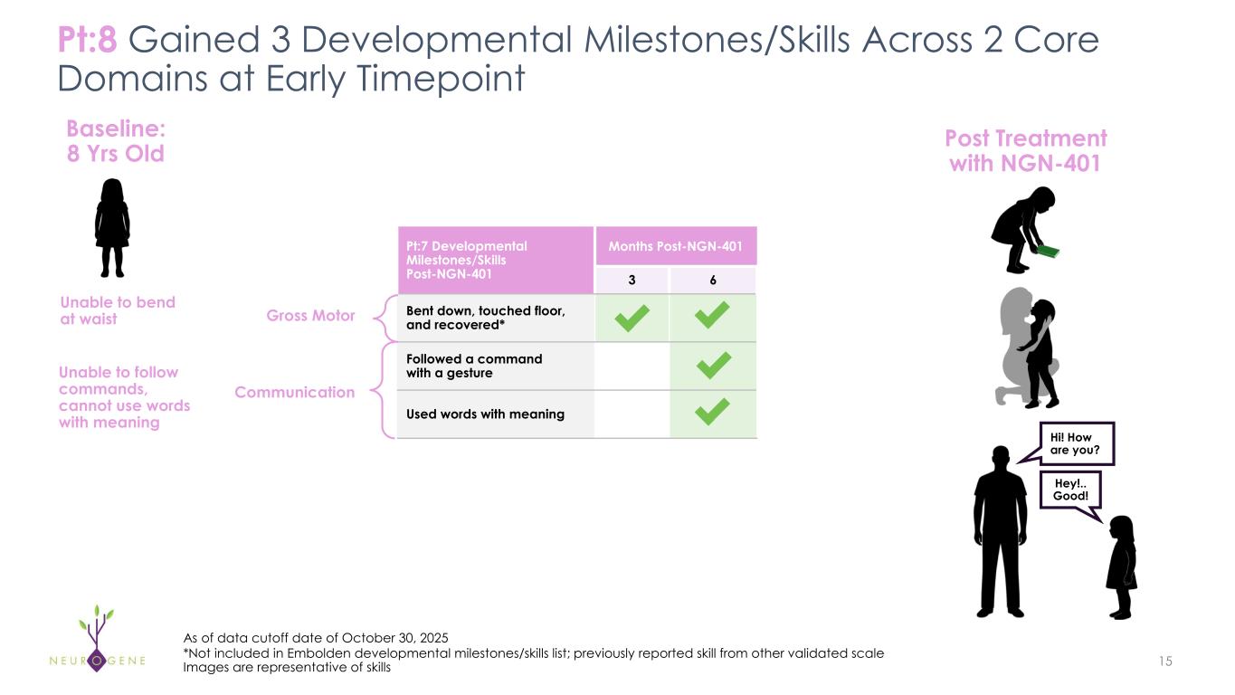 Pt:7 Gained 1 Developmental Milestone/Skill at Early Timepoint 14 As of data cutoff date of October 30, 2025 Images are representative of skills Pt:7 Developmental Milestones/Skills Post-NGN-401 Months Post-NGN-401 3 6 Used a spoon/fork to eat without assistance Baseline: 6 Yrs Old Fine Motor Post Treatment with NGN-401 Could not use utensils