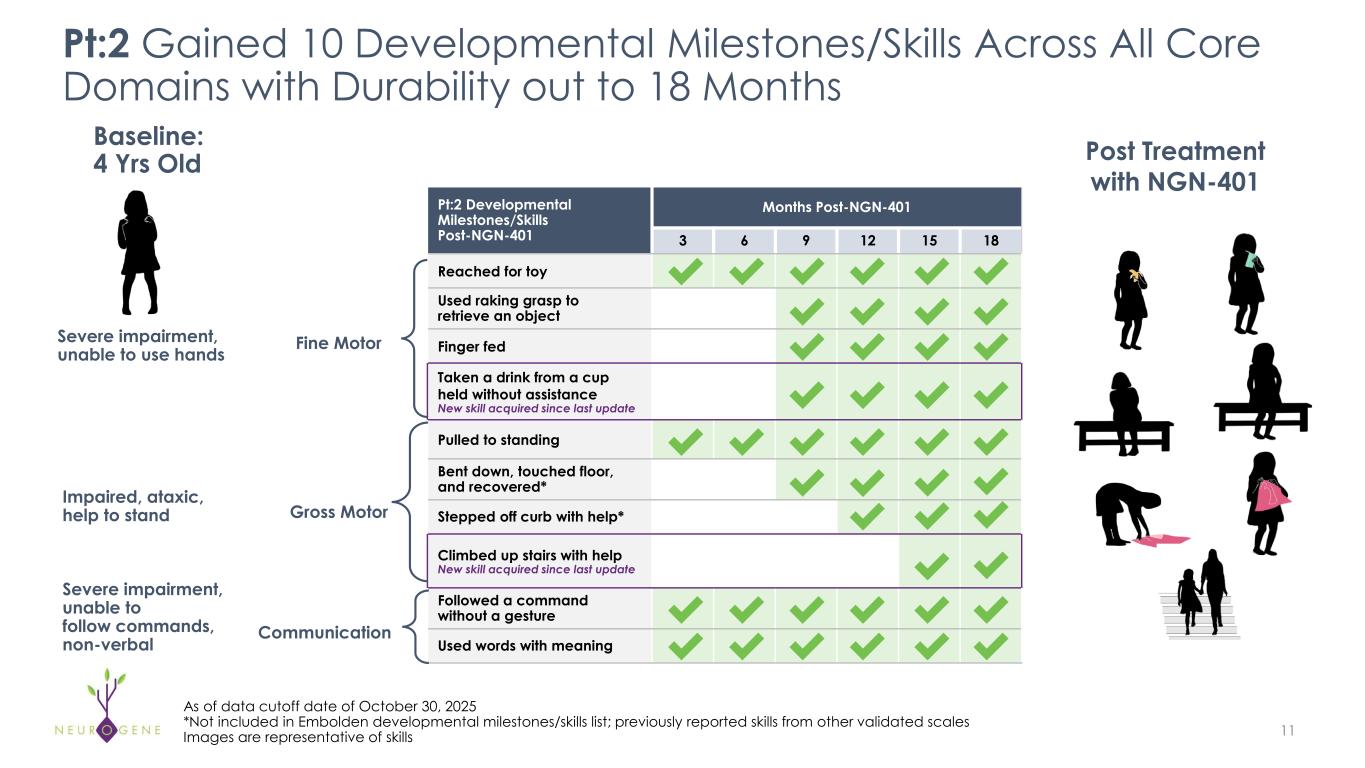 Pt:1 Gained 11 Developmental Milestones/Skills Across All Core Domains with Durability out to 24 Months 10 As of data cutoff date of October 30, 2025 *Not included in Embolden developmental milestones/skills list; previously reported skill from other validated scale Images are representative of skills Pt:1 Developmental Milestones/Skills Post-NGN-401 Months Post-NGN-401 3 6 9 12 15 18 24 Used a pincer grasp (either refined or modified) Taken a drink from a cup held without assistance Used a spoon/fork to eat without assistance Transferred an object from one hand to the other Heel-to-toe walking* Climbed up stairs without help Climbed down stairs without help Come to sitting New skill acquired since last update Followed a command without gesture Waves bye bye Pointed for something they want Fine Motor Gross Motor Communication Baseline: 7 Yrs Old Walking, ataxic gait, no ability to climb stairs Raking, no ability to hold objects Severe impairment, unable to follow commands, indicate wishes Post Treatment with NGN-401