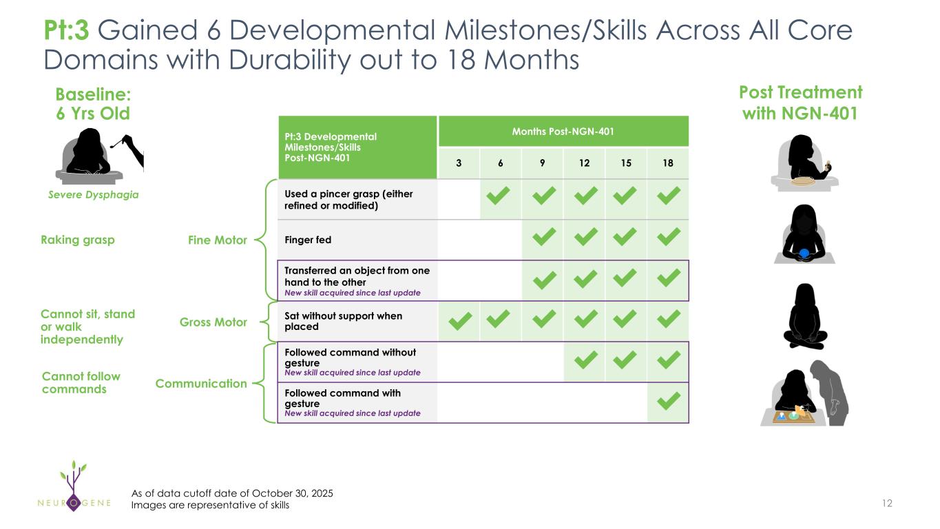 Pt:2 Gained 10 Developmental Milestones/Skills Across All Core Domains with Durability out to 18 Months 11 As of data cutoff date of October 30, 2025 *Not included in Embolden developmental milestones/skills list; previously reported skills from other validated scales Images are representative of skills Pt:2 Developmental Milestones/Skills Post-NGN-401 Months Post-NGN-401 3 6 9 12 15 18 Reached for toy Used raking grasp to retrieve an object Finger fed Taken a drink from a cup held without assistance New skill acquired since last update Pulled to standing Bent down, touched floor, and recovered* Stepped off curb with help* Climbed up stairs with help New skill acquired since last update Followed a command without a gesture Used words with meaning Fine Motor Gross Motor Communication Baseline: 4 Yrs Old Impaired, ataxic, help to stand Severe impairment, unable to use hands Severe impairment, unable to follow commands, non-verbal Post Treatment with NGN-401