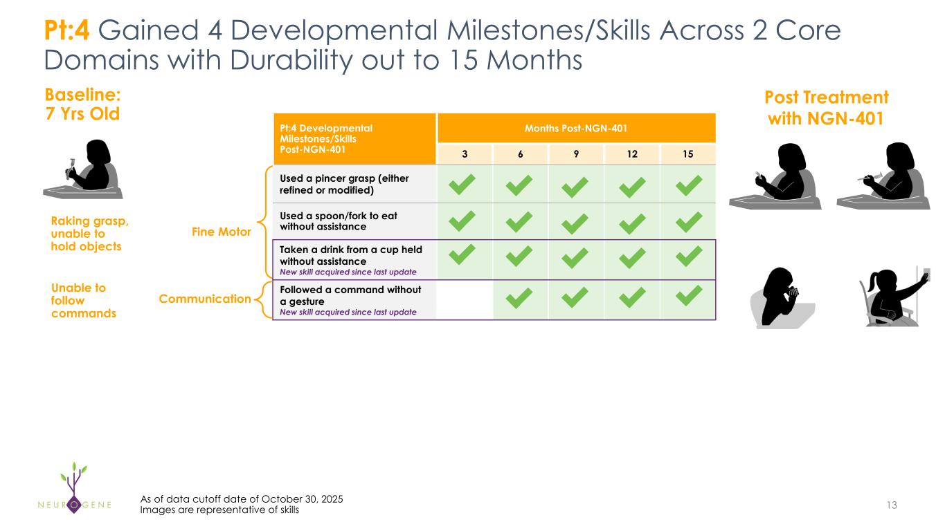 Fine Motor Gross Motor Pt:3 Gained 6 Developmental Milestones/Skills Across All Core Domains with Durability out to 18 Months 12 As of data cutoff date of October 30, 2025 Images are representative of skills Pt:3 Developmental Milestones/Skills Post-NGN-401 Months Post-NGN-401 3 6 9 12 15 18 Used a pincer grasp (either refined or modified) Finger fed Transferred an object from one hand to the other New skill acquired since last update Sat without support when placed Followed command without gesture New skill acquired since last update Followed command with gesture New skill acquired since last update Baseline: 6 Yrs Old Cannot sit, stand or walk independently Raking grasp Post Treatment with NGN-401 Severe Dysphagia Communication Cannot follow commands