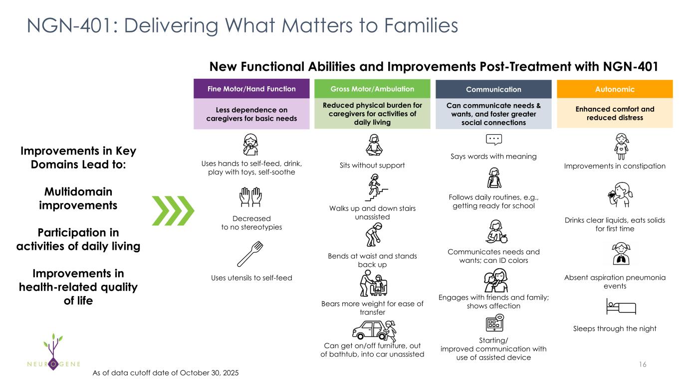 Pt:8 Gained 3 Developmental Milestones/Skills Across 2 Core Domains at Early Timepoint 15 As of data cutoff date of October 30, 2025 *Not included in Embolden developmental milestones/skills list; previously reported skill from other validated scale Images are representative of skills Pt:7 Developmental Milestones/Skills Post-NGN-401 Months Post-NGN-401 3 6 Bent down, touched floor, and recovered* Followed a command with a gesture Used words with meaning Baseline: 8 Yrs Old Gross Motor Communication Unable to follow commands, cannot use words with meaning Unable to bend at waist Post Treatment with NGN-401 Hi! How are you? Hey!.. Good!