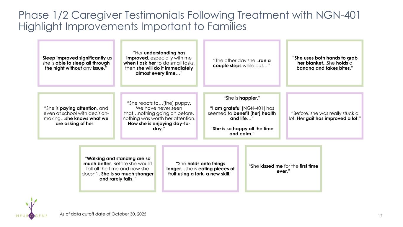 Communication Can communicate needs & wants, and foster greater social connections Says words with meaning Follows daily routines, e.g., getting ready for school Communicates needs and wants; can ID colors Engages with friends and family; shows affection Starting/ improved communication with use of assisted device Autonomic Enhanced comfort and reduced distress Improvements in constipation Drinks clear liquids, eats solids for first time Absent aspiration pneumonia events Sleeps through the night Gross Motor/Ambulation Reduced physical burden for caregivers for activities of daily living Sits without support Walks up and down stairs unassisted Bends at waist and stands back up Bears more weight for ease of transfer Can get on/off furniture, out of bathtub, into car unassisted Fine Motor/Hand Function Less dependence on caregivers for basic needs Uses hands to self-feed, drink, play with toys, self-soothe Decreased to no stereotypies Uses utensils to self-feed 16 As of data cutoff date of October 30, 2025 NGN-401: Delivering What Matters to Families New Functional Abilities and Improvements Post-Treatment with NGN-401 Improvements in Key Domains Lead to: Multidomain improvements Participation in activities of daily living Improvements in health-related quality of life