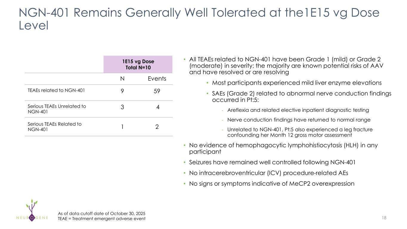 “Sleep improved significantly as she is able to sleep all through the night without any issue.” “Her understanding has improved, especially with me when I ask her to do small tasks, then she will do it immediately almost every time…” “The other day she...ran a couple steps while out…” “She uses both hands to grab her blanket...She holds a banana and takes bites.” “She is paying attention, and even at school with decision- making…she knows what we are asking of her.” “She reacts to…[the] puppy. We have never seen that…nothing going on before, nothing was worth her attention. Now she is enjoying day-to- day.” “She is happier.” “I am grateful [NGN-401] has seemed to benefit [her] health and life…” “She is so happy all the time and calm.” “Before, she was really stuck a lot. Her gait has improved a lot.” “Walking and standing are so much better. Before she would fall all the time and now she doesn’t. She is so much stronger and rarely falls.” “She holds onto things longer…she is eating pieces of fruit using a fork, a new skill.” “She kissed me for the first time ever.” 17As of data cutoff date of October 30, 2025 Phase 1/2 Caregiver Testimonials Following Treatment with NGN-401 Highlight Improvements Important to Families