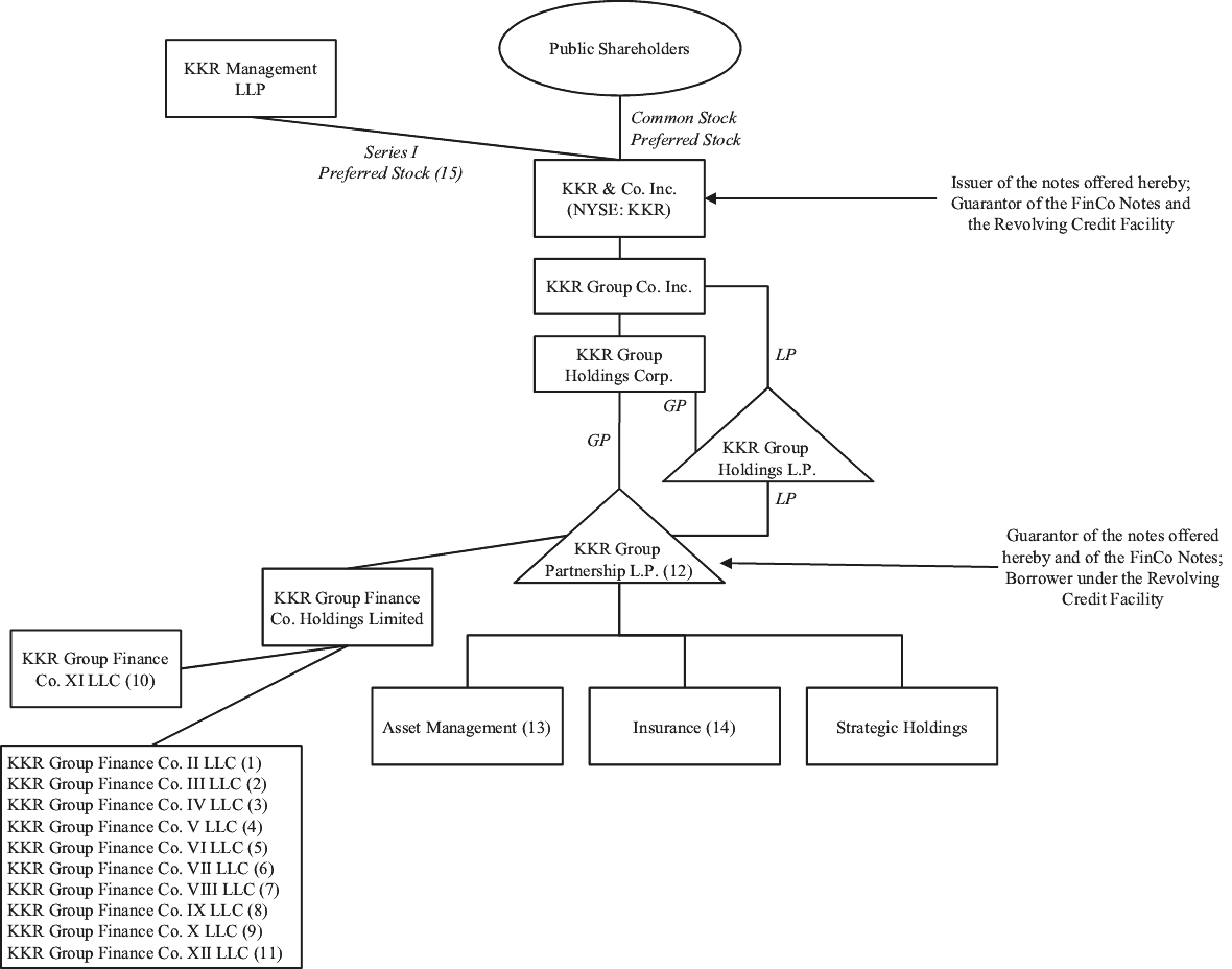 The notes will be fully and unconditionally guaranteed, jointly and severally, on a subordinated basis, by KKR Group Partnership L.P. (the “Initial Guarantor”) and any other entity that is required to become a guarantor of the notes as provided under “Description of the Notes—Guarantees” (together with the Initial Guarantor, the “Guarantors”). We and the Initial Guarantor are holding companies, and the notes are not guaranteed by any of our revenue generating businesses or investment vehicles. The notes and the guarantees will be our and the Guarantors’ direct and unsecured obligations and will (a) be subordinated and junior in right of payment and upon our liquidation to all of our and their respective existing and future unsecured and unsubordinated indebtedness, including (i) our and the Initial Guarantor’s respective guarantees of the FinCo Senior Notes (as defined herein) and (ii) our obligations as a guarantor and the Initial Guarantor's obligations as a borrower under the Revolving Credit Facility (as defined herein), (b) rank equal to any of our and their respective subordinated indebtedness, including our and the Initial Guarantor’s respective guarantees of the $500,000,000 aggregate principal amount of 4.625% Subordinated Notes due 2061 (the “2061 Subordinated Notes” and, together with the FinCo Senior Notes, the “FinCo Notes”) issued by KKR Group Finance Co. IX LLC, our indirect finance subsidiary, (c) be effectively subordinated to all of our and their respective secured indebtedness to the extent of the value of the assets securing that indebtedness and (d) be structurally subordinated to all of the indebtedness (including the FinCo Notes, the KFN Notes (as defined herein), the Global Atlantic Indebtedness (as defined herein) and the KCM Indebtedness (as defined herein)), liabilities and other obligations of each of our subsidiaries that does not guarantee the notes.