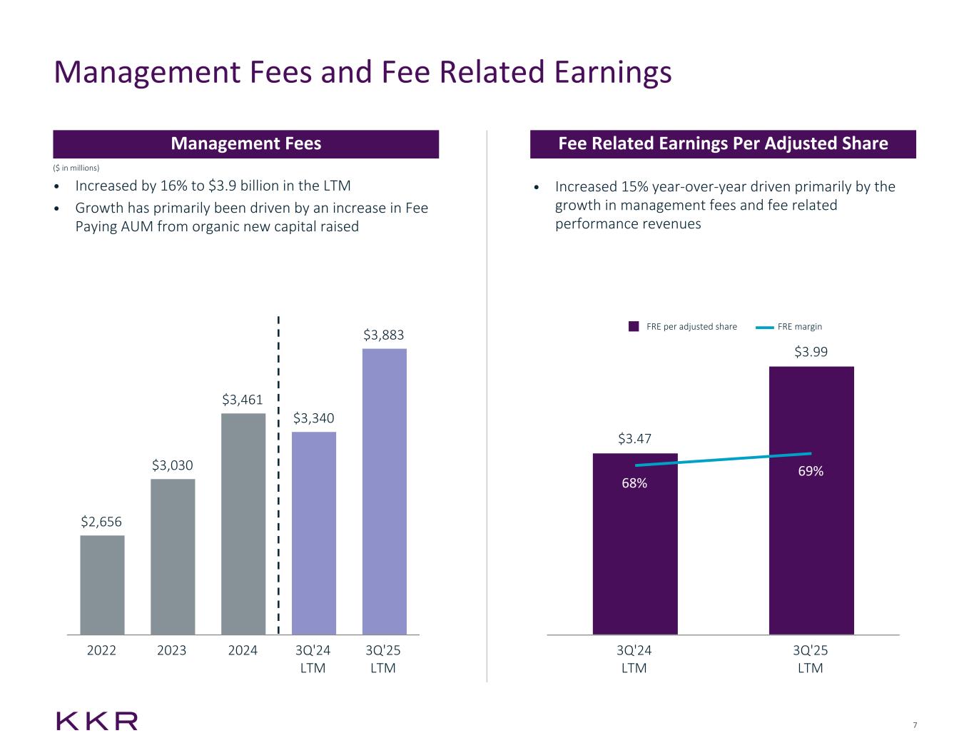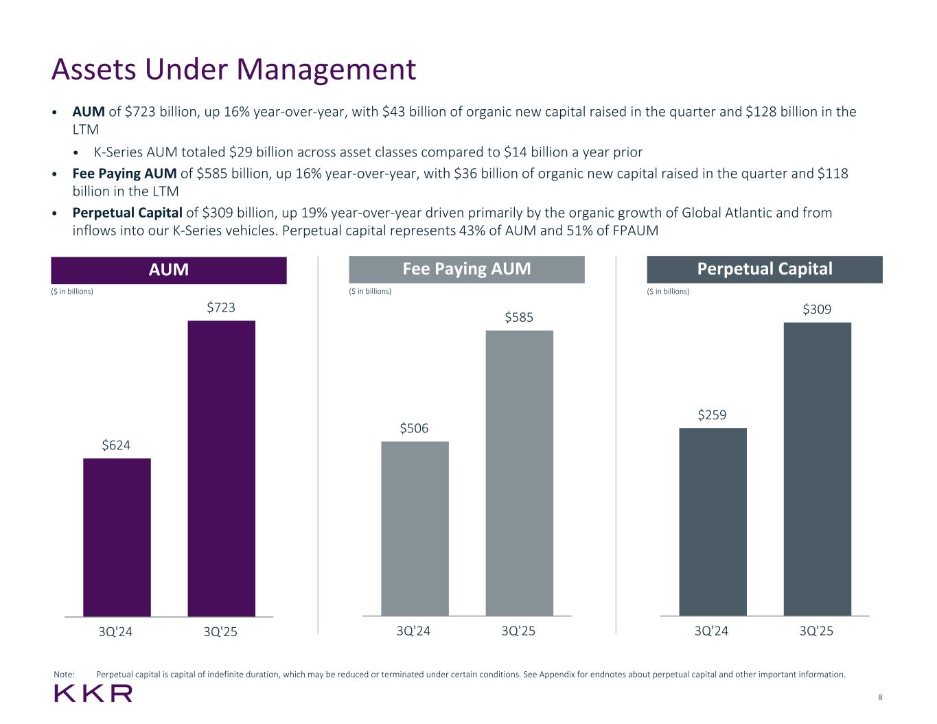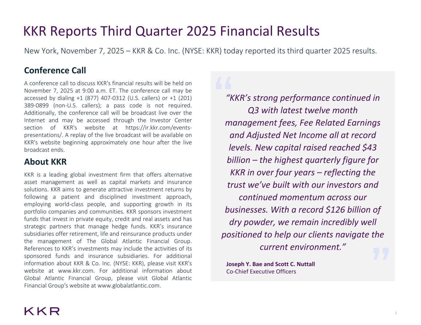 i “KKR’s strong performance continued in Q3 with latest twelve month management fees, Fee Related Earnings and Adjusted Net Income all at record levels. New capital raised reached $43 billion – the highest quarterly figure for KKR in over four years – reflecting the trust we’ve built with our investors and continued momentum across our businesses. With a record $126 billion of dry powder, we remain incredibly well positioned to help our clients navigate the current environment.” Conference Call A conference call to discuss KKR's financial results will be held on November 7, 2025 at 9:00 a.m. ET. The conference call may be accessed by dialing +1 (877) 407-0312 (U.S. callers) or +1 (201) 389-0899 (non-U.S. callers); a pass code is not required. Additionally, the conference call will be broadcast live over the Internet and may be accessed through the Investor Center section of KKR's website at https://ir.kkr.com/events- presentations/. A replay of the live broadcast will be available on KKR's website beginning approximately one hour after the live broadcast ends. About KKR KKR is a leading global investment firm that offers alternative asset management as well as capital markets and insurance solutions. KKR aims to generate attractive investment returns by following a patient and disciplined investment approach, employing world-class people, and supporting growth in its portfolio companies and communities. KKR sponsors investment funds that invest in private equity, credit and real assets and has strategic partners that manage hedge funds. KKR’s insurance subsidiaries offer retirement, life and reinsurance products under the management of The Global Atlantic Financial Group. References to KKR’s investments may include the activities of its sponsored funds and insurance subsidiaries. For additional information about KKR & Co. Inc. (NYSE: KKR), please visit KKR's website at www.kkr.com. For additional information about Global Atlantic Financial Group, please visit Global Atlantic Financial Group's website at www.globalatlantic.com. New York, November 7, 2025 – KKR & Co. Inc. (NYSE: KKR) today reported its third quarter 2025 results. KKR Reports Third Quarter 2025 Financial Results Joseph Y. Bae and Scott C. Nuttall Co-Chief Executive Officers