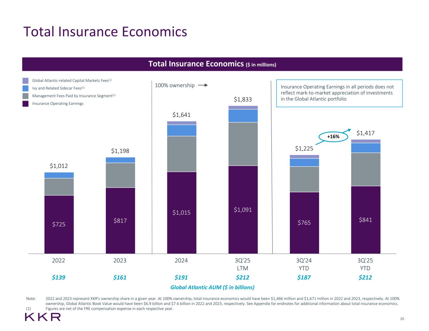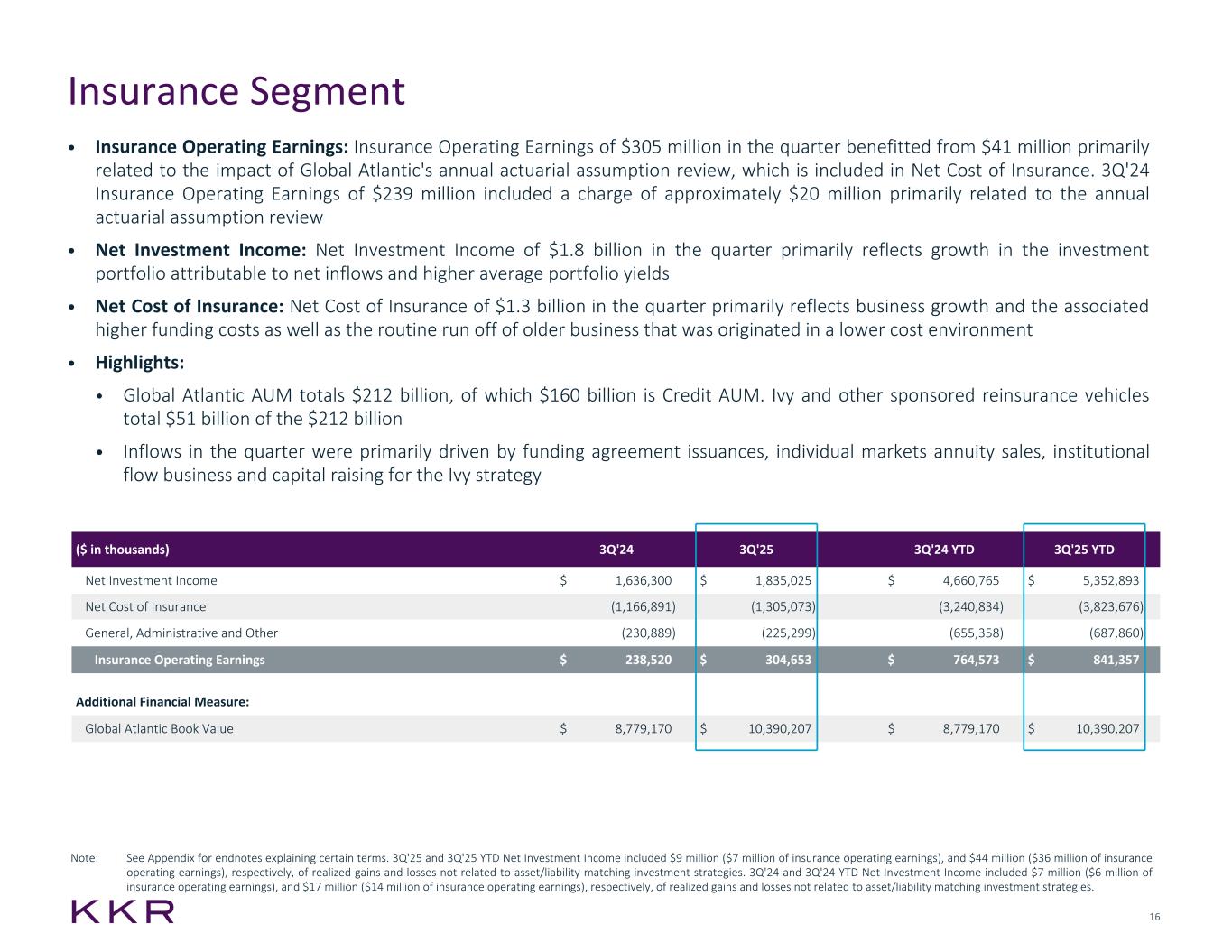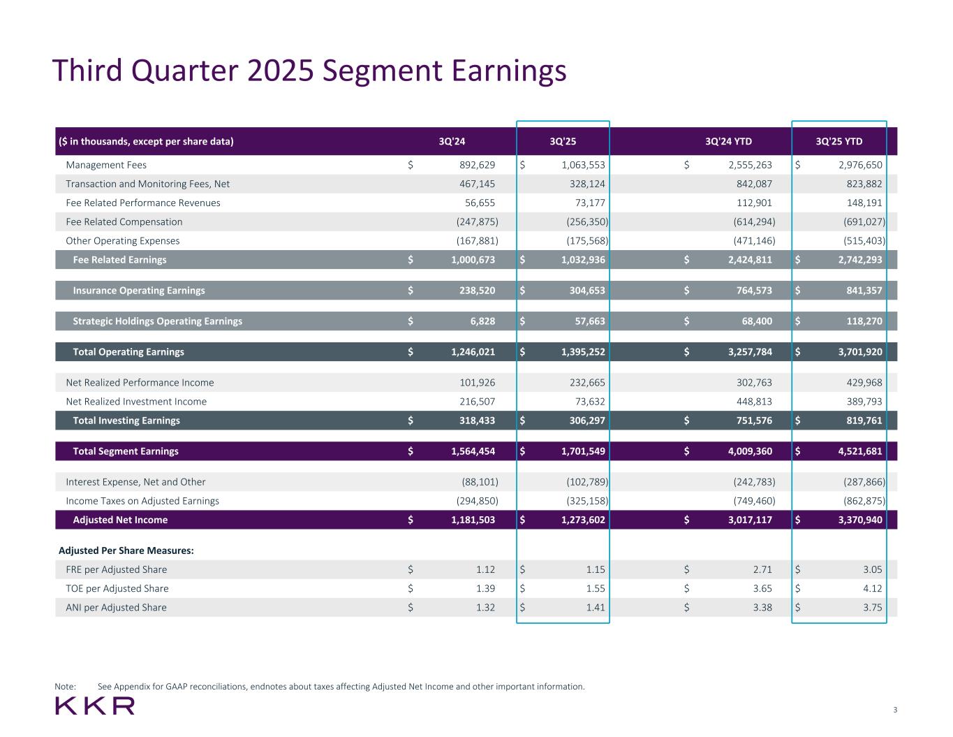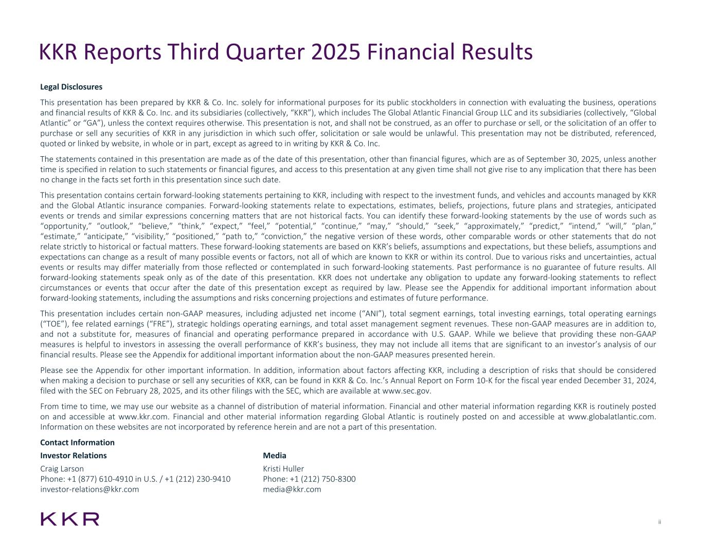 ii KKR Reports Third Quarter 2025 Financial Results Investor Relations Craig Larson Phone: +1 (877) 610-4910 in U.S. / +1 (212) 230-9410 investor-relations@kkr.com Media Kristi Huller Phone: +1 (212) 750-8300 media@kkr.com Legal Disclosures This presentation has been prepared by KKR & Co. Inc. solely for informational purposes for its public stockholders in connection with evaluating the business, operations and financial results of KKR & Co. Inc. and its subsidiaries (collectively, “KKR”), which includes The Global Atlantic Financial Group LLC and its subsidiaries (collectively, “Global Atlantic” or “GA”), unless the context requires otherwise. This presentation is not, and shall not be construed, as an offer to purchase or sell, or the solicitation of an offer to purchase or sell any securities of KKR in any jurisdiction in which such offer, solicitation or sale would be unlawful. This presentation may not be distributed, referenced, quoted or linked by website, in whole or in part, except as agreed to in writing by KKR & Co. Inc. The statements contained in this presentation are made as of the date of this presentation, other than financial figures, which are as of September 30, 2025, unless another time is specified in relation to such statements or financial figures, and access to this presentation at any given time shall not give rise to any implication that there has been no change in the facts set forth in this presentation since such date. This presentation contains certain forward-looking statements pertaining to KKR, including with respect to the investment funds, and vehicles and accounts managed by KKR and the Global Atlantic insurance companies. Forward-looking statements relate to expectations, estimates, beliefs, projections, future plans and strategies, anticipated events or trends and similar expressions concerning matters that are not historical facts. You can identify these forward-looking statements by the use of words such as “opportunity,” “outlook,” “believe,” “think,” “expect,” “feel,” “potential,” “continue,” “may,” “should,” “seek,” “approximately,” “predict,” “intend,” “will,” “plan,” “estimate,” “anticipate,” “visibility,” “positioned,” “path to,” “conviction,” the negative version of these words, other comparable words or other statements that do not relate strictly to historical or factual matters. These forward-looking statements are based on KKR’s beliefs, assumptions and expectations, but these beliefs, assumptions and expectations can change as a result of many possible events or factors, not all of which are known to KKR or within its control. Due to various risks and uncertainties, actual events or results may differ materially from those reflected or contemplated in such forward-looking statements. Past performance is no guarantee of future results. All forward-looking statements speak only as of the date of this presentation. KKR does not undertake any obligation to update any forward-looking statements to reflect circumstances or events that occur after the date of this presentation except as required by law. Please see the Appendix for additional important information about forward-looking statements, including the assumptions and risks concerning projections and estimates of future performance. This presentation includes certain non-GAAP measures, including adjusted net income (“ANI”), total segment earnings, total investing earnings, total operating earnings (“TOE”), fee related earnings (“FRE”), strategic holdings operating earnings, and total asset management segment revenues. These non-GAAP measures are in addition to, and not a substitute for, measures of financial and operating performance prepared in accordance with U.S. GAAP. While we believe that providing these non-GAAP measures is helpful to investors in assessing the overall performance of KKR’s business, they may not include all items that are significant to an investor’s analysis of our financial results. Please see the Appendix for additional important information about the non-GAAP measures presented herein. Please see the Appendix for other important information. In addition, information about factors affecting KKR, including a description of risks that should be considered when making a decision to purchase or sell any securities of KKR, can be found in KKR & Co. Inc.’s Annual Report on Form 10-K for the fiscal year ended December 31, 2024, filed with the SEC on February 28, 2025, and its other filings with the SEC, which are available at www.sec.gov. From time to time, we may use our website as a channel of distribution of material information. Financial and other material information regarding KKR is routinely posted on and accessible at www.kkr.com. Financial and other material information regarding Global Atlantic is routinely posted on and accessible at www.globalatlantic.com. Information on these websites are not incorporated by reference herein and are not a part of this presentation. Contact Information
