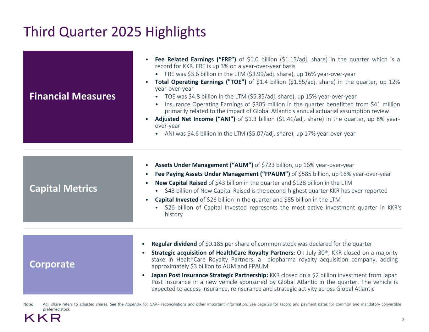 2 • Regular dividend of $0.185 per share of common stock was declared for the quarter • Strategic acquisition of HealthCare Royalty Partners: On July 30th, KKR closed on a majority stake in HealthCare Royalty Partners, a biopharma royalty acquisition company, adding approximately $3 billion to AUM and FPAUM • Japan Post Insurance Strategic Partnership: KKR closed on a $2 billion investment from Japan Post Insurance in a new vehicle sponsored by Global Atlantic in the quarter. The vehicle is expected to access insurance, reinsurance and strategic activity across Global Atlantic Capital Metrics Third Quarter 2025 Highlights • Fee Related Earnings (“FRE”) of $1.0 billion ($1.15/adj. share) in the quarter which is a record for KKR. FRE is up 3% on a year-over-year basis • FRE was $3.6 billion in the LTM ($3.99/adj. share), up 16% year-over-year • Total Operating Earnings ("TOE") of $1.4 billion ($1.55/adj. share) in the quarter, up 12% year-over-year • TOE was $4.8 billion in the LTM ($5.35/adj. share), up 15% year-over-year • Insurance Operating Earnings of $305 million in the quarter benefitted from $41 million primarily related to the impact of Global Atlantic's annual actuarial assumption review • Adjusted Net Income (“ANI”) of $1.3 billion ($1.41/adj. share) in the quarter, up 8% year- over-year • ANI was $4.6 billion in the LTM ($5.07/adj. share), up 17% year-over-year • Assets Under Management (“AUM”) of $723 billion, up 16% year-over-year • Fee Paying Assets Under Management (“FPAUM”) of $585 billion, up 16% year-over-year • New Capital Raised of $43 billion in the quarter and $128 billion in the LTM • $43 billion of New Capital Raised is the second-highest quarter KKR has ever reported • Capital Invested of $26 billion in the quarter and $85 billion in the LTM • $26 billion of Capital Invested represents the most active investment quarter in KKR's history Note: Adj. share refers to adjusted shares. See the Appendix for GAAP reconciliations and other important information. See page 28 for record and payment dates for common and mandatory convertible preferred stock. Financial Measures Corporate