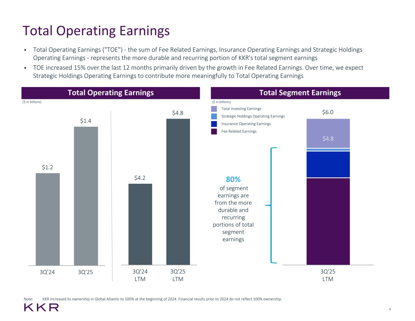 3 Third Quarter 2025 Segment Earnings Note: See Appendix for GAAP reconciliations, endnotes about taxes affecting Adjusted Net Income and other important information. ($ in thousands, except per share data) 3Q'24 3Q'25 3Q'24 YTD 3Q'25 YTD Management Fees $ 892,629 $ 1,063,553 $ 2,555,263 $ 2,976,650 Transaction and Monitoring Fees, Net 467,145 328,124 842,087 823,882 Fee Related Performance Revenues 56,655 73,177 112,901 148,191 Fee Related Compensation (247,875) (256,350) (614,294) (691,027) Other Operating Expenses (167,881) (175,568) (471,146) (515,403) Fee Related Earnings $ 1,000,673 $ 1,032,936 $ 2,424,811 $ 2,742,293 Insurance Operating Earnings $ 238,520 $ 304,653 $ 764,573 $ 841,357 Strategic Holdings Operating Earnings $ 6,828 $ 57,663 $ 68,400 $ 118,270 Total Operating Earnings $ 1,246,021 $ 1,395,252 $ 3,257,784 $ 3,701,920 Net Realized Performance Income 101,926 232,665 302,763 429,968 Net Realized Investment Income 216,507 73,632 448,813 389,793 Total Investing Earnings $ 318,433 $ 306,297 $ 751,576 $ 819,761 Total Segment Earnings $ 1,564,454 $ 1,701,549 $ 4,009,360 $ 4,521,681 Interest Expense, Net and Other (88,101) (102,789) (242,783) (287,866) Income Taxes on Adjusted Earnings (294,850) (325,158) (749,460) (862,875) Adjusted Net Income $ 1,181,503 $ 1,273,602 $ 3,017,117 $ 3,370,940 Adjusted Per Share Measures: FRE per Adjusted Share $ 1.12 $ 1.15 $ 2.71 $ 3.05 TOE per Adjusted Share $ 1.39 $ 1.55 $ 3.65 $ 4.12 ANI per Adjusted Share $ 1.32 $ 1.41 $ 3.38 $ 3.75
