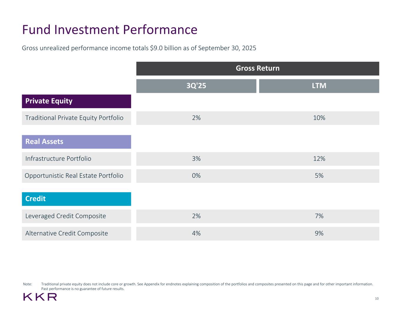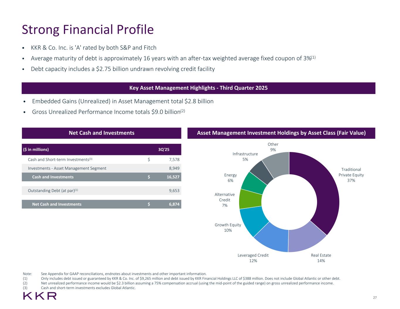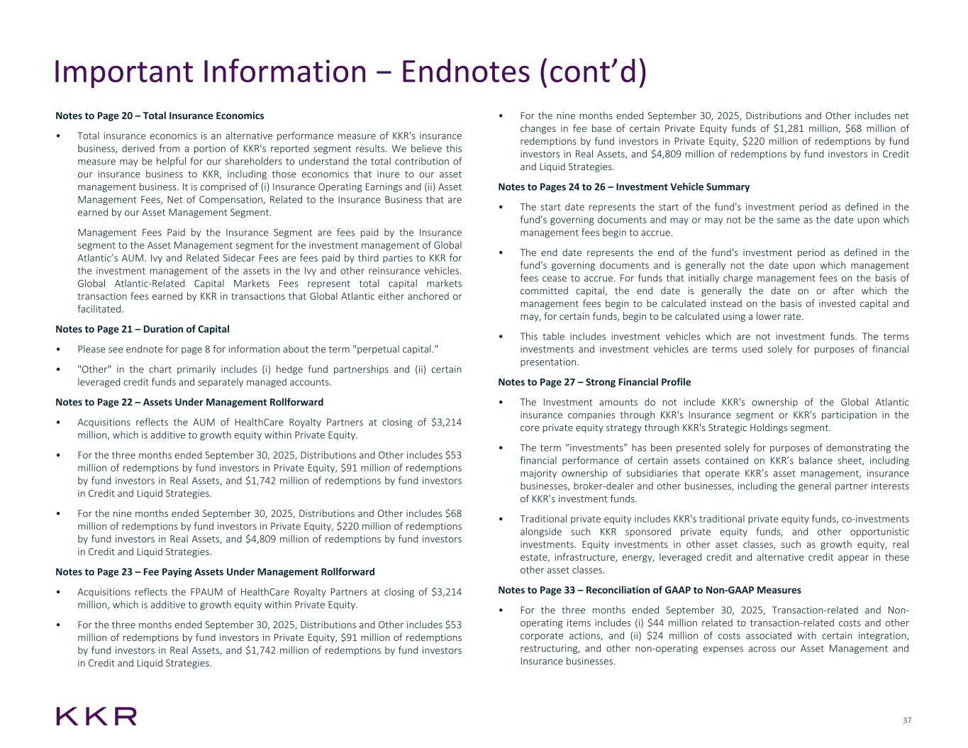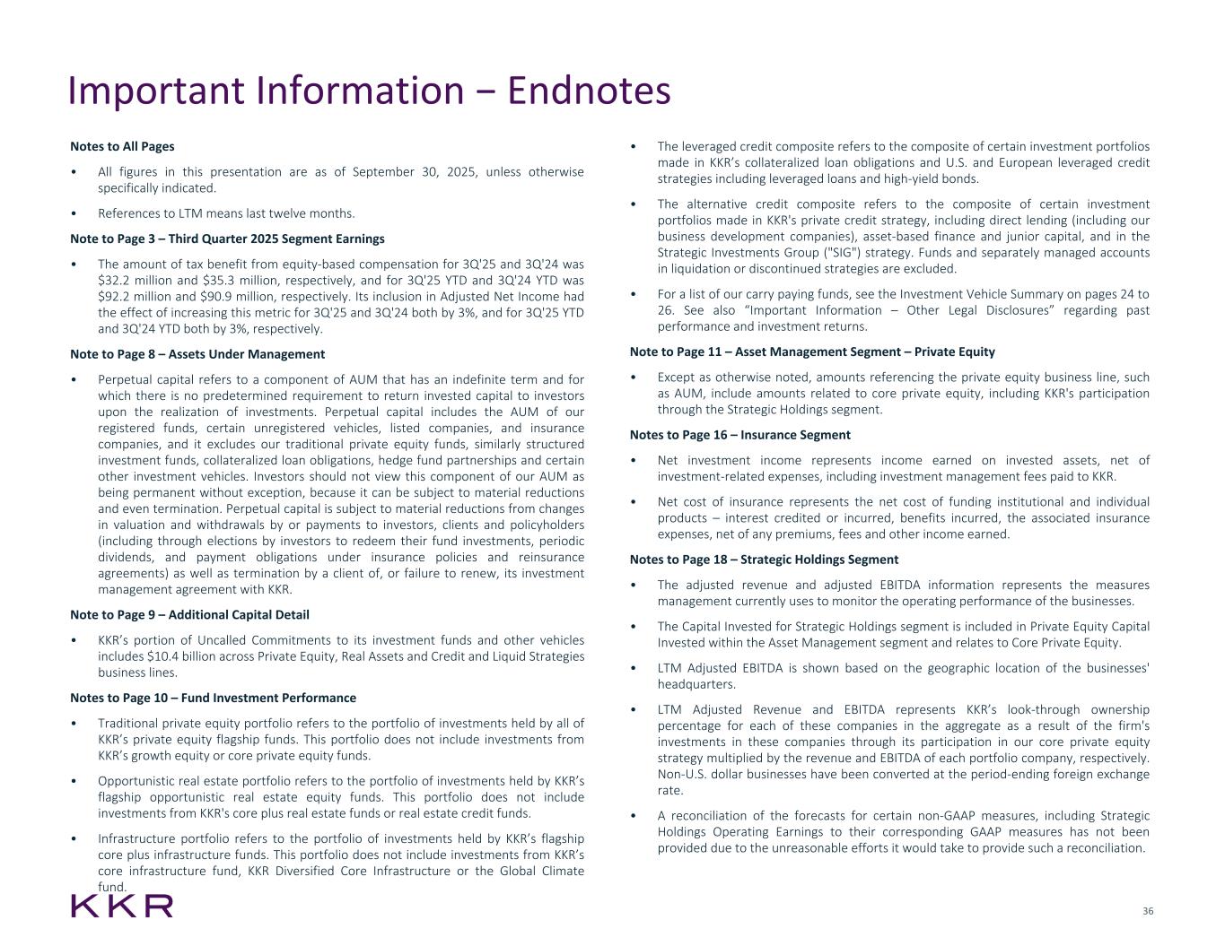 36 • The leveraged credit composite refers to the composite of certain investment portfolios made in KKR’s collateralized loan obligations and U.S. and European leveraged credit strategies including leveraged loans and high-yield bonds. • The alternative credit composite refers to the composite of certain investment portfolios made in KKR's private credit strategy, including direct lending (including our business development companies), asset-based finance and junior capital, and in the Strategic Investments Group ("SIG") strategy. Funds and separately managed accounts in liquidation or discontinued strategies are excluded. • For a list of our carry paying funds, see the Investment Vehicle Summary on pages 24 to 26. See also “Important Information – Other Legal Disclosures” regarding past performance and investment returns. Note to Page 11 – Asset Management Segment – Private Equity • Except as otherwise noted, amounts referencing the private equity business line, such as AUM, include amounts related to core private equity, including KKR's participation through the Strategic Holdings segment. Notes to Page 16 – Insurance Segment • Net investment income represents income earned on invested assets, net of investment-related expenses, including investment management fees paid to KKR. • Net cost of insurance represents the net cost of funding institutional and individual products – interest credited or incurred, benefits incurred, the associated insurance expenses, net of any premiums, fees and other income earned. Notes to Page 18 – Strategic Holdings Segment • The adjusted revenue and adjusted EBITDA information represents the measures management currently uses to monitor the operating performance of the businesses. • The Capital Invested for Strategic Holdings segment is included in Private Equity Capital Invested within the Asset Management segment and relates to Core Private Equity. • LTM Adjusted EBITDA is shown based on the geographic location of the businesses' headquarters. • LTM Adjusted Revenue and EBITDA represents KKR’s look-through ownership percentage for each of these companies in the aggregate as a result of the firm's investments in these companies through its participation in our core private equity strategy multiplied by the revenue and EBITDA of each portfolio company, respectively. Non-U.S. dollar businesses have been converted at the period-ending foreign exchange rate. • A reconciliation of the forecasts for certain non-GAAP measures, including Strategic Holdings Operating Earnings to their corresponding GAAP measures has not been provided due to the unreasonable efforts it would take to provide such a reconciliation. Notes to All Pages • All figures in this presentation are as of September 30, 2025, unless otherwise specifically indicated. • References to LTM means last twelve months. Note to Page 3 – Third Quarter 2025 Segment Earnings • The amount of tax benefit from equity-based compensation for 3Q'25 and 3Q'24 was $32.2 million and $35.3 million, respectively, and for 3Q'25 YTD and 3Q'24 YTD was $92.2 million and $90.9 million, respectively. Its inclusion in Adjusted Net Income had the effect of increasing this metric for 3Q'25 and 3Q'24 both by 3%, and for 3Q'25 YTD and 3Q'24 YTD both by 3%, respectively. Note to Page 8 – Assets Under Management • Perpetual capital refers to a component of AUM that has an indefinite term and for which there is no predetermined requirement to return invested capital to investors upon the realization of investments. Perpetual capital includes the AUM of our registered funds, certain unregistered vehicles, listed companies, and insurance companies, and it excludes our traditional private equity funds, similarly structured investment funds, collateralized loan obligations, hedge fund partnerships and certain other investment vehicles. Investors should not view this component of our AUM as being permanent without exception, because it can be subject to material reductions and even termination. Perpetual capital is subject to material reductions from changes in valuation and withdrawals by or payments to investors, clients and policyholders (including through elections by investors to redeem their fund investments, periodic dividends, and payment obligations under insurance policies and reinsurance agreements) as well as termination by a client of, or failure to renew, its investment management agreement with KKR. Note to Page 9 – Additional Capital Detail • KKR’s portion of Uncalled Commitments to its investment funds and other vehicles includes $10.4 billion across Private Equity, Real Assets and Credit and Liquid Strategies business lines. Notes to Page 10 – Fund Investment Performance • Traditional private equity portfolio refers to the portfolio of investments held by all of KKR’s private equity flagship funds. This portfolio does not include investments from KKR’s growth equity or core private equity funds. • Opportunistic real estate portfolio refers to the portfolio of investments held by KKR’s flagship opportunistic real estate equity funds. This portfolio does not include investments from KKR's core plus real estate funds or real estate credit funds. • Infrastructure portfolio refers to the portfolio of investments held by KKR’s flagship core plus infrastructure funds. This portfolio does not include investments from KKR’s core infrastructure fund, KKR Diversified Core Infrastructure or the Global Climate fund. Important Information − Endnotes
