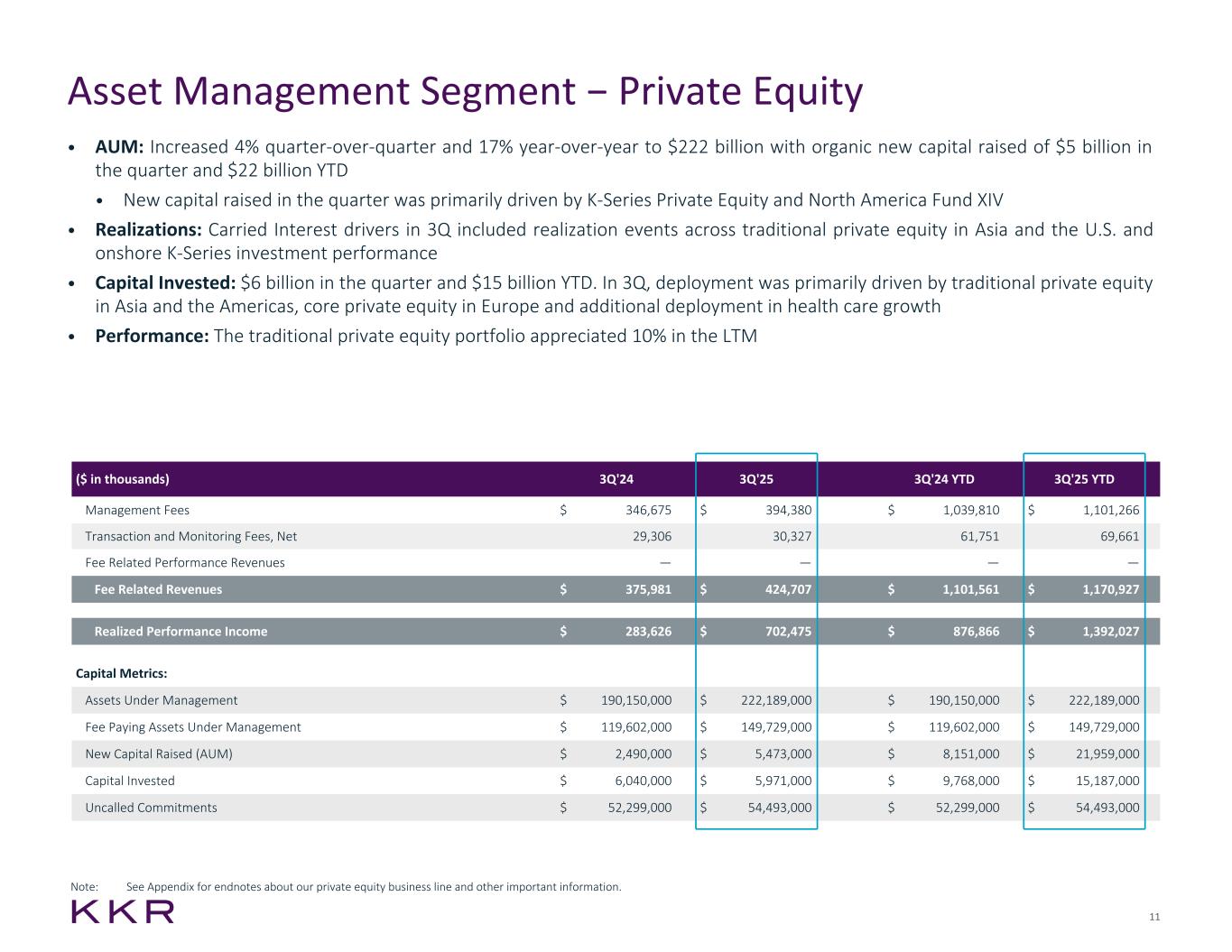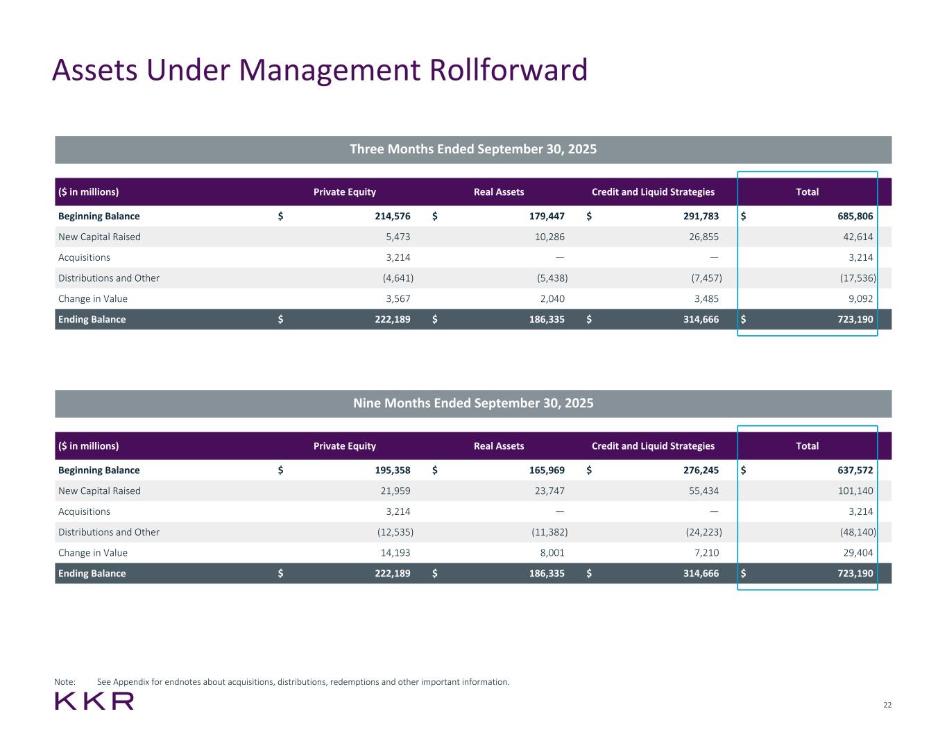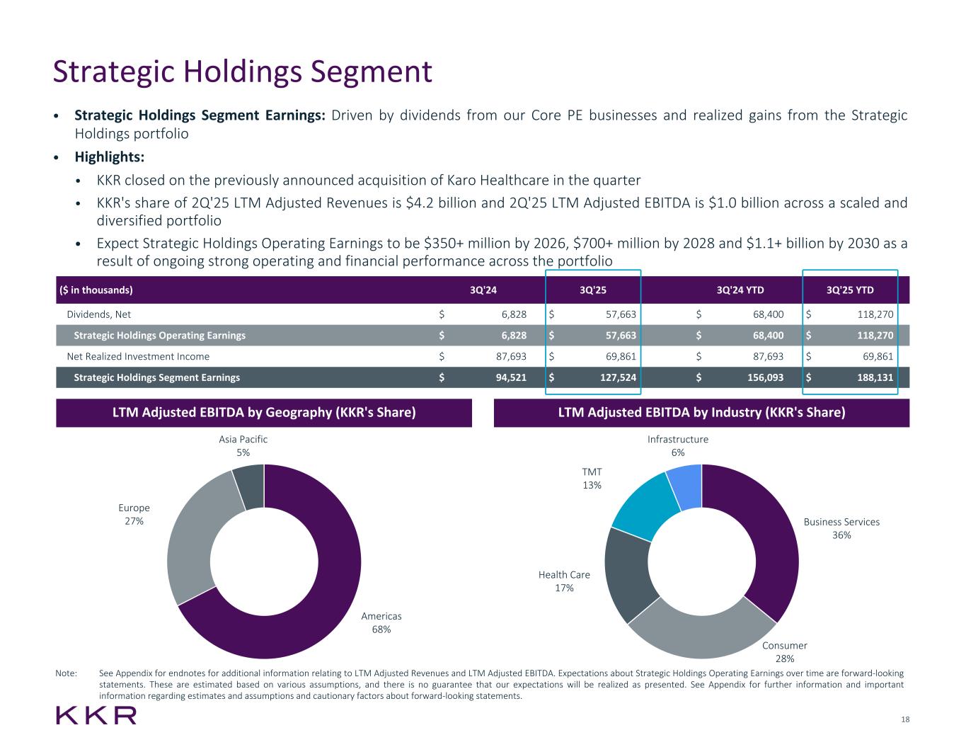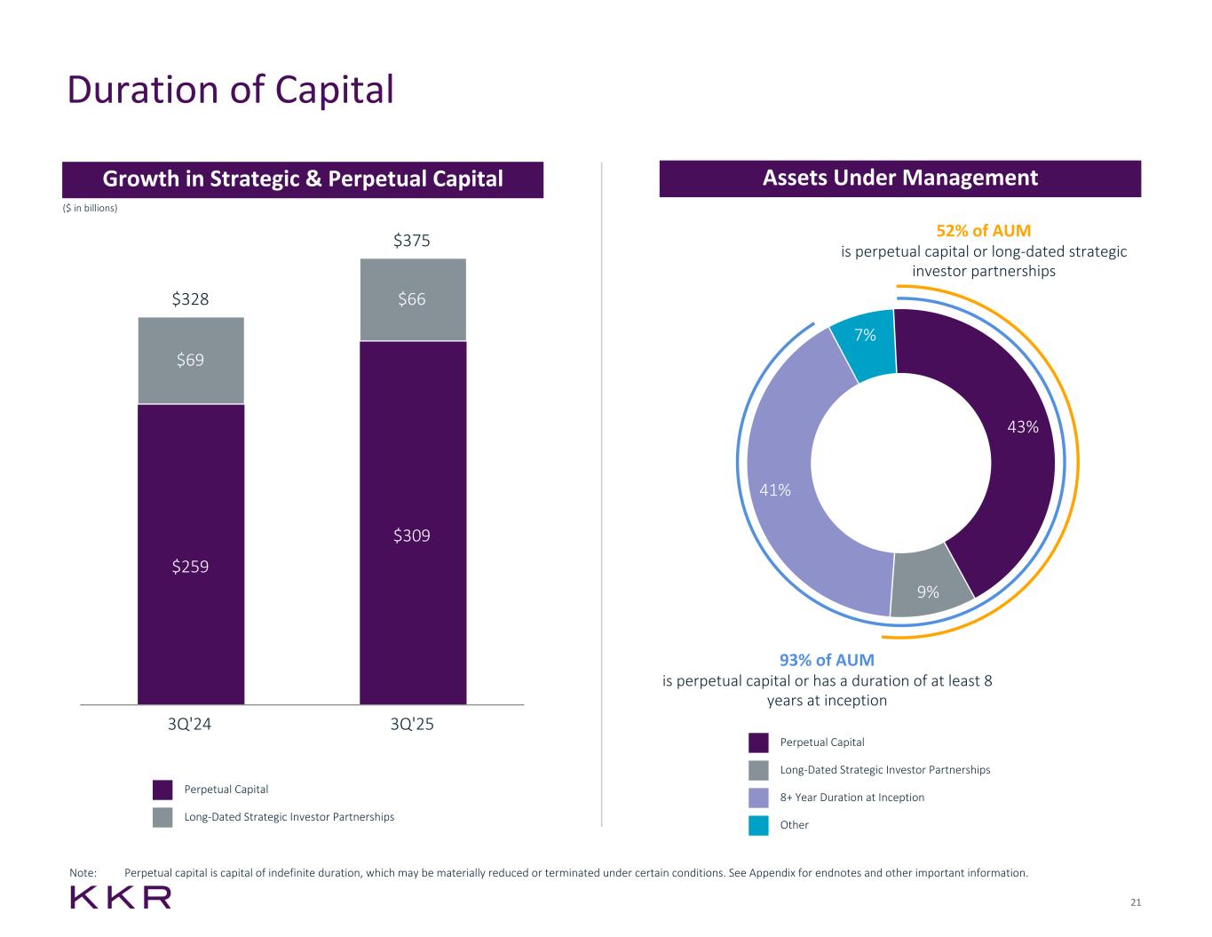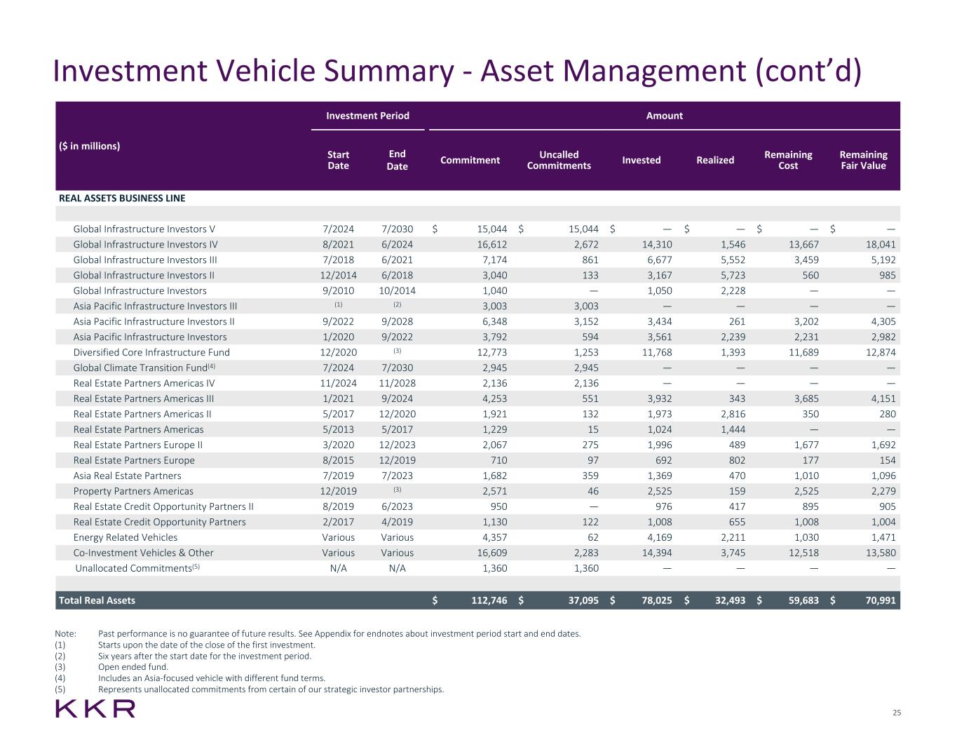 36 • The leveraged credit composite refers to the composite of certain investment portfolios made in KKR’s collateralized loan obligations and U.S. and European leveraged credit strategies including leveraged loans and high-yield bonds. • The alternative credit composite refers to the composite of certain investment portfolios made in KKR's private credit strategy, including direct lending (including our business development companies), asset-based finance and junior capital, and in the Strategic Investments Group ("SIG") strategy. Funds and separately managed accounts in liquidation or discontinued strategies are excluded. • For a list of our carry paying funds, see the Investment Vehicle Summary on pages 24 to 26. See also “Important Information – Other Legal Disclosures” regarding past performance and investment returns. Note to Page 11 – Asset Management Segment – Private Equity • Except as otherwise noted, amounts referencing the private equity business line, such as AUM, include amounts related to core private equity, including KKR's participation through the Strategic Holdings segment. Notes to Page 16 – Insurance Segment • Net investment income represents income earned on invested assets, net of investment-related expenses, including investment management fees paid to KKR. • Net cost of insurance represents the net cost of funding institutional and individual products – interest credited or incurred, benefits incurred, the associated insurance expenses, net of any premiums, fees and other income earned. Notes to Page 18 – Strategic Holdings Segment • The adjusted revenue and adjusted EBITDA information represents the measures management currently uses to monitor the operating performance of the businesses. • The Capital Invested for Strategic Holdings segment is included in Private Equity Capital Invested within the Asset Management segment and relates to Core Private Equity. • LTM Adjusted EBITDA is shown based on the geographic location of the businesses' headquarters. • LTM Adjusted Revenue and EBITDA represents KKR’s look-through ownership percentage for each of these companies in the aggregate as a result of the firm's investments in these companies through its participation in our core private equity strategy multiplied by the revenue and EBITDA of each portfolio company, respectively. Non-U.S. dollar businesses have been converted at the period-ending foreign exchange rate. • A reconciliation of the forecasts for certain non-GAAP measures, including Strategic Holdings Operating Earnings to their corresponding GAAP measures has not been provided due to the unreasonable efforts it would take to provide such a reconciliation. Notes to All Pages • All figures in this presentation are as of September 30, 2025, unless otherwise specifically indicated. • References to LTM means last twelve months. Note to Page 3 – Third Quarter 2025 Segment Earnings • The amount of tax benefit from equity-based compensation for 3Q'25 and 3Q'24 was $32.2 million and $35.3 million, respectively, and for 3Q'25 YTD and 3Q'24 YTD was $92.2 million and $90.9 million, respectively. Its inclusion in Adjusted Net Income had the effect of increasing this metric for 3Q'25 and 3Q'24 both by 3%, and for 3Q'25 YTD and 3Q'24 YTD both by 3%, respectively. Note to Page 8 – Assets Under Management • Perpetual capital refers to a component of AUM that has an indefinite term and for which there is no predetermined requirement to return invested capital to investors upon the realization of investments. Perpetual capital includes the AUM of our registered funds, certain unregistered vehicles, listed companies, and insurance companies, and it excludes our traditional private equity funds, similarly structured investment funds, collateralized loan obligations, hedge fund partnerships and certain other investment vehicles. Investors should not view this component of our AUM as being permanent without exception, because it can be subject to material reductions and even termination. Perpetual capital is subject to material reductions from changes in valuation and withdrawals by or payments to investors, clients and policyholders (including through elections by investors to redeem their fund investments, periodic dividends, and payment obligations under insurance policies and reinsurance agreements) as well as termination by a client of, or failure to renew, its investment management agreement with KKR. Note to Page 9 – Additional Capital Detail • KKR’s portion of Uncalled Commitments to its investment funds and other vehicles includes $10.4 billion across Private Equity, Real Assets and Credit and Liquid Strategies business lines. Notes to Page 10 – Fund Investment Performance • Traditional private equity portfolio refers to the portfolio of investments held by all of KKR’s private equity flagship funds. This portfolio does not include investments from KKR’s growth equity or core private equity funds. • Opportunistic real estate portfolio refers to the portfolio of investments held by KKR’s flagship opportunistic real estate equity funds. This portfolio does not include investments from KKR's core plus real estate funds or real estate credit funds. • Infrastructure portfolio refers to the portfolio of investments held by KKR’s flagship core plus infrastructure funds. This portfolio does not include investments from KKR’s core infrastructure fund, KKR Diversified Core Infrastructure or the Global Climate fund. Important Information − Endnotes