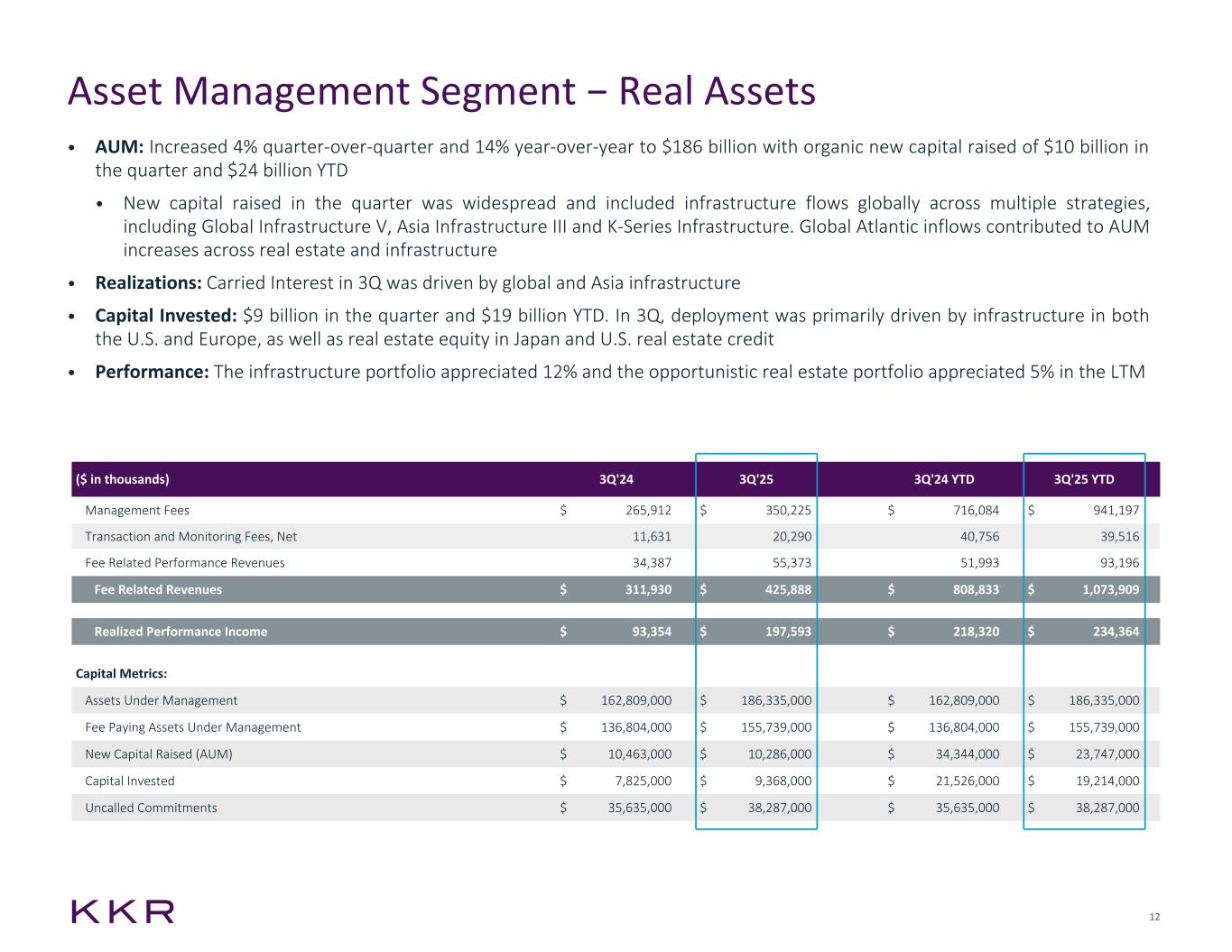 11 • AUM: Increased 4% quarter-over-quarter and 17% year-over-year to $222 billion with organic new capital raised of $5 billion in the quarter and $22 billion YTD • New capital raised in the quarter was primarily driven by K-Series Private Equity and North America Fund XIV • Realizations: Carried Interest drivers in 3Q included realization events across traditional private equity in Asia and the U.S. and onshore K-Series investment performance • Capital Invested: $6 billion in the quarter and $15 billion YTD. In 3Q, deployment was primarily driven by traditional private equity in Asia and the Americas, core private equity in Europe and additional deployment in health care growth • Performance: The traditional private equity portfolio appreciated 10% in the LTM Asset Management Segment − Private Equity ($ in thousands) 3Q'24 3Q'25 3Q'24 YTD 3Q'25 YTD Management Fees $ 346,675 $ 394,380 $ 1,039,810 $ 1,101,266 Transaction and Monitoring Fees, Net 29,306 30,327 61,751 69,661 Fee Related Performance Revenues — — — — Fee Related Revenues $ 375,981 $ 424,707 $ 1,101,561 $ 1,170,927 Realized Performance Income $ 283,626 $ 702,475 $ 876,866 $ 1,392,027 Capital Metrics: Assets Under Management $ 190,150,000 $ 222,189,000 $ 190,150,000 $ 222,189,000 Fee Paying Assets Under Management $ 119,602,000 $ 149,729,000 $ 119,602,000 $ 149,729,000 New Capital Raised (AUM) $ 2,490,000 $ 5,473,000 $ 8,151,000 $ 21,959,000 Capital Invested $ 6,040,000 $ 5,971,000 $ 9,768,000 $ 15,187,000 Uncalled Commitments $ 52,299,000 $ 54,493,000 $ 52,299,000 $ 54,493,000 Note: See Appendix for endnotes about our private equity business line and other important information.
