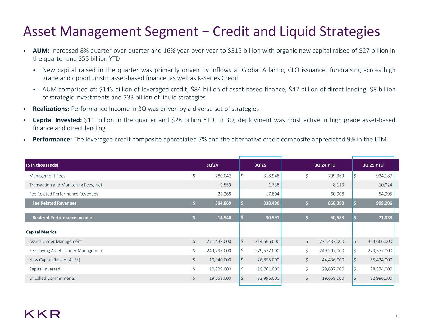 12 Asset Management Segment − Real Assets • AUM: Increased 4% quarter-over-quarter and 14% year-over-year to $186 billion with organic new capital raised of $10 billion in the quarter and $24 billion YTD • New capital raised in the quarter was widespread and included infrastructure flows globally across multiple strategies, including Global Infrastructure V, Asia Infrastructure III and K-Series Infrastructure. Global Atlantic inflows contributed to AUM increases across real estate and infrastructure • Realizations: Carried Interest in 3Q was driven by global and Asia infrastructure • Capital Invested: $9 billion in the quarter and $19 billion YTD. In 3Q, deployment was primarily driven by infrastructure in both the U.S. and Europe, as well as real estate equity in Japan and U.S. real estate credit • Performance: The infrastructure portfolio appreciated 12% and the opportunistic real estate portfolio appreciated 5% in the LTM ($ in thousands) 3Q'24 3Q'25 3Q'24 YTD 3Q'25 YTD Management Fees $ 265,912 $ 350,225 $ 716,084 $ 941,197 Transaction and Monitoring Fees, Net 11,631 20,290 40,756 39,516 Fee Related Performance Revenues 34,387 55,373 51,993 93,196 Fee Related Revenues $ 311,930 $ 425,888 $ 808,833 $ 1,073,909 Realized Performance Income $ 93,354 $ 197,593 $ 218,320 $ 234,364 Capital Metrics: Assets Under Management $ 162,809,000 $ 186,335,000 $ 162,809,000 $ 186,335,000 Fee Paying Assets Under Management $ 136,804,000 $ 155,739,000 $ 136,804,000 $ 155,739,000 New Capital Raised (AUM) $ 10,463,000 $ 10,286,000 $ 34,344,000 $ 23,747,000 Capital Invested $ 7,825,000 $ 9,368,000 $ 21,526,000 $ 19,214,000 Uncalled Commitments $ 35,635,000 $ 38,287,000 $ 35,635,000 $ 38,287,000