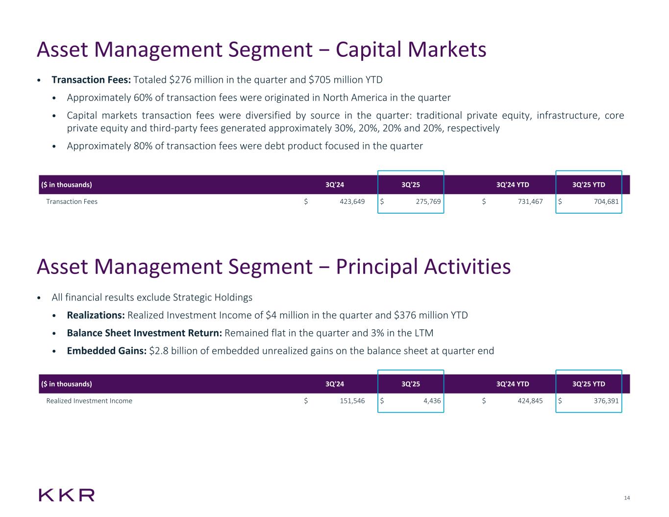 13 • AUM: Increased 8% quarter-over-quarter and 16% year-over-year to $315 billion with organic new capital raised of $27 billion in the quarter and $55 billion YTD • New capital raised in the quarter was primarily driven by inflows at Global Atlantic, CLO issuance, fundraising across high grade and opportunistic asset-based finance, as well as K-Series Credit • AUM comprised of: $143 billion of leveraged credit, $84 billion of asset-based finance, $47 billion of direct lending, $8 billion of strategic investments and $33 billion of liquid strategies • Realizations: Performance Income in 3Q was driven by a diverse set of strategies • Capital Invested: $11 billion in the quarter and $28 billion YTD. In 3Q, deployment was most active in high grade asset-based finance and direct lending • Performance: The leveraged credit composite appreciated 7% and the alternative credit composite appreciated 9% in the LTM ($ in thousands) 3Q'24 3Q'25 3Q'24 YTD 3Q'25 YTD Management Fees $ 280,042 $ 318,948 $ 799,369 $ 934,187 Transaction and Monitoring Fees, Net 2,559 1,738 8,113 10,024 Fee Related Performance Revenues 22,268 17,804 60,908 54,995 Fee Related Revenues $ 304,869 $ 338,490 $ 868,390 $ 999,206 Realized Performance Income $ 14,940 $ 30,591 $ 50,588 $ 71,038 Capital Metrics: Assets Under Management $ 271,437,000 $ 314,666,000 $ 271,437,000 $ 314,666,000 Fee Paying Assets Under Management $ 249,297,000 $ 279,577,000 $ 249,297,000 $ 279,577,000 New Capital Raised (AUM) $ 10,940,000 $ 26,855,000 $ 44,436,000 $ 55,434,000 Capital Invested $ 10,229,000 $ 10,761,000 $ 29,637,000 $ 28,374,000 Uncalled Commitments $ 19,658,000 $ 32,996,000 $ 19,658,000 $ 32,996,000 Asset Management Segment − Credit and Liquid Strategies