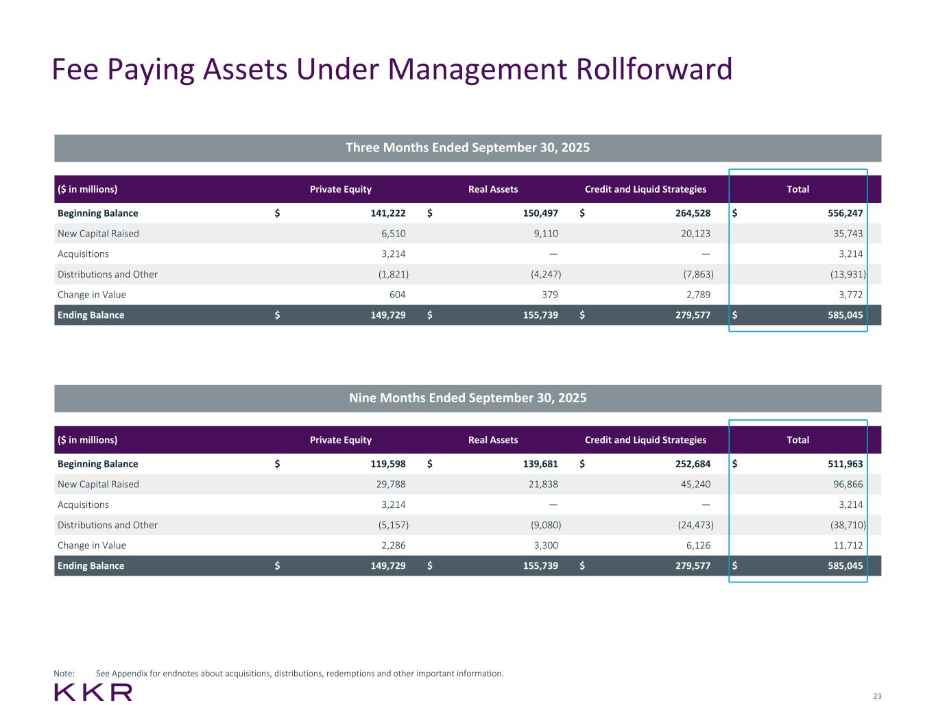 22 Assets Under Management Rollforward Nine Months Ended September 30, 2025 ($ in millions) Private Equity Real Assets Credit and Liquid Strategies Total Beginning Balance $ 195,358 $ 165,969 $ 276,245 $ 637,572 New Capital Raised 21,959 23,747 55,434 101,140 Acquisitions 3,214 — — 3,214 Distributions and Other (12,535) (11,382) (24,223) (48,140) Change in Value 14,193 8,001 7,210 29,404 Ending Balance $ 222,189 $ 186,335 $ 314,666 $ 723,190 ($ in millions) Private Equity Real Assets Credit and Liquid Strategies Total Beginning Balance $ 214,576 $ 179,447 $ 291,783 $ 685,806 New Capital Raised 5,473 10,286 26,855 42,614 Acquisitions 3,214 — — 3,214 Distributions and Other (4,641) (5,438) (7,457) (17,536) Change in Value 3,567 2,040 3,485 9,092 Ending Balance $ 222,189 $ 186,335 $ 314,666 $ 723,190 Three Months Ended September 30, 2025 Note: See Appendix for endnotes about acquisitions, distributions, redemptions and other important information.