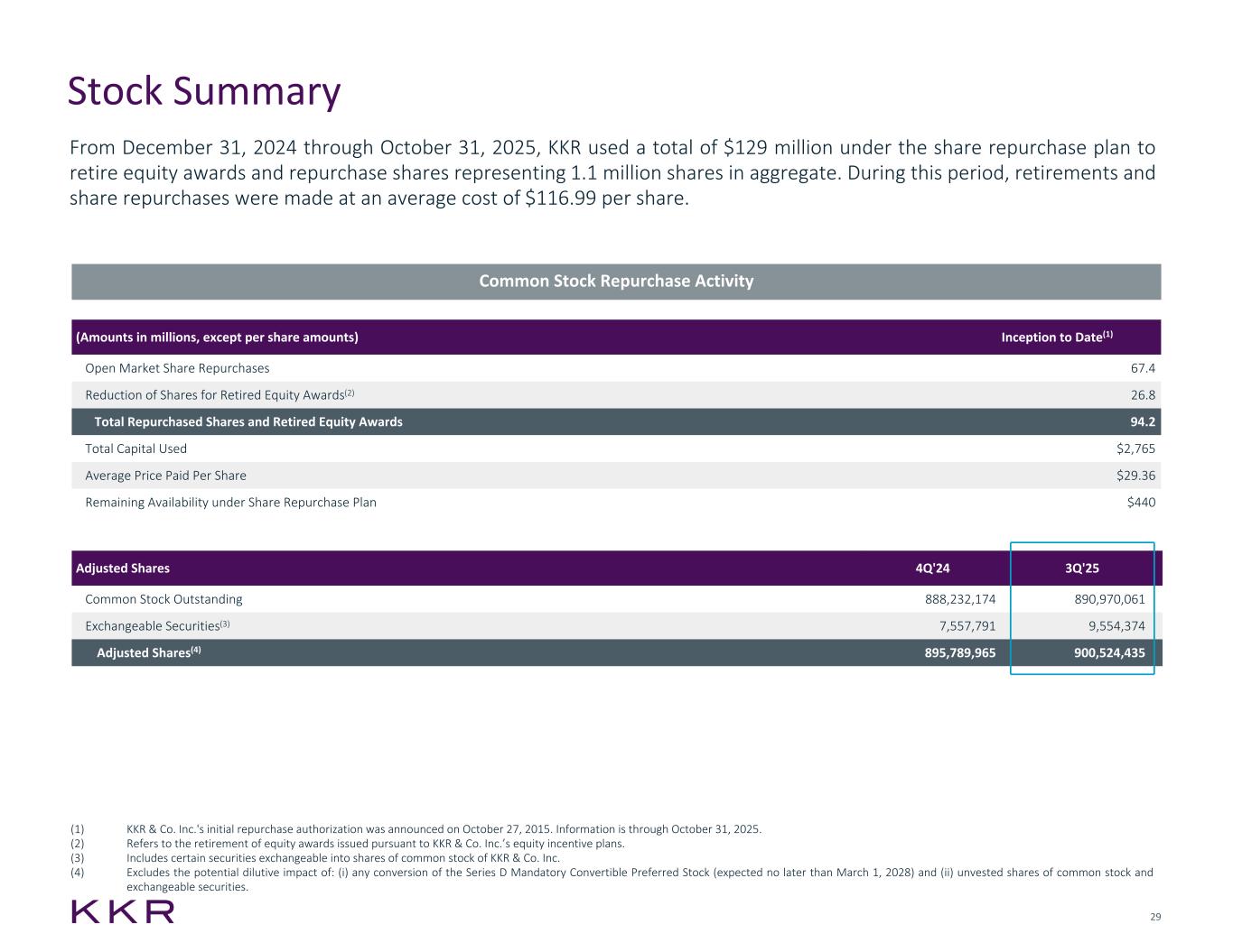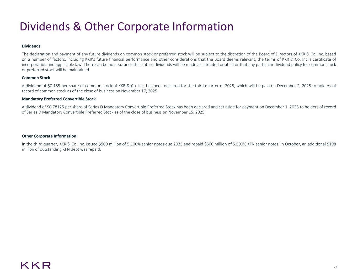 28 Dividends & Other Corporate Information Dividends The declaration and payment of any future dividends on common stock or preferred stock will be subject to the discretion of the Board of Directors of KKR & Co. Inc. based on a number of factors, including KKR’s future financial performance and other considerations that the Board deems relevant, the terms of KKR & Co. Inc.'s certificate of incorporation and applicable law. There can be no assurance that future dividends will be made as intended or at all or that any particular dividend policy for common stock or preferred stock will be maintained. Common Stock A dividend of $0.185 per share of common stock of KKR & Co. Inc. has been declared for the third quarter of 2025, which will be paid on December 2, 2025 to holders of record of common stock as of the close of business on November 17, 2025. Mandatory Preferred Convertible Stock A dividend of $0.78125 per share of Series D Mandatory Convertible Preferred Stock has been declared and set aside for payment on December 1, 2025 to holders of record of Series D Mandatory Convertible Preferred Stock as of the close of business on November 15, 2025. Other Corporate Information In the third quarter, KKR & Co. Inc. issued $900 million of 5.100% senior notes due 2035 and repaid $500 million of 5.500% KFN senior notes. In October, an additional $198 million of outstanding KFN debt was repaid.
