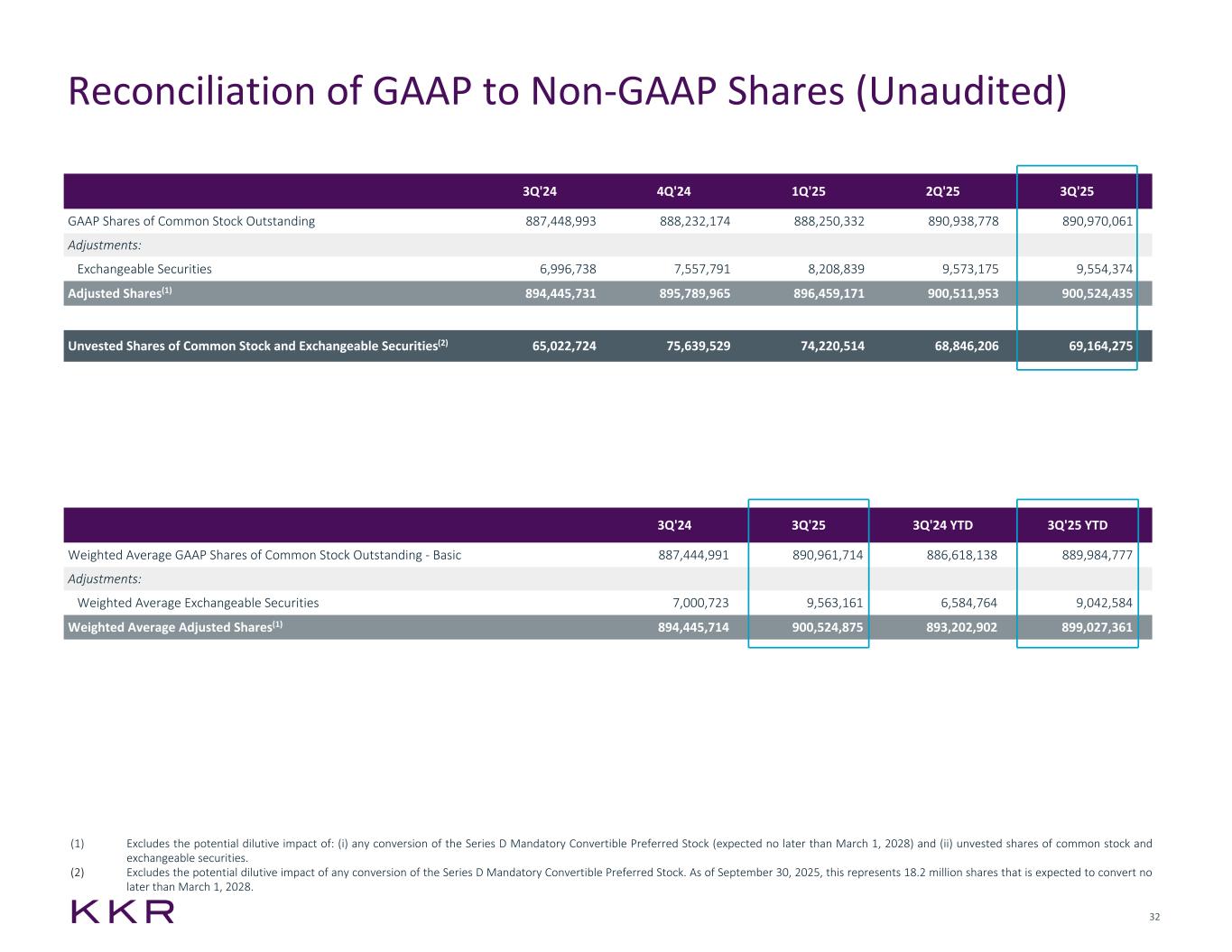 1 Third Quarter 2025 GAAP Results (Unaudited) GAAP Net Income (Loss) Attributable to KKR & Co. Inc. Common Stockholders was $0.9 billion for the quarter and $1.1 billion YTD. ($ in thousands, except per share data) 3Q'24 3Q'25 3Q'24 YTD 3Q'25 YTD Revenues Asset Management and Strategic Holdings $ 2,269,090 $ 1,744,002 $ 5,786,007 $ 5,625,083 Insurance 2,522,606 3,781,973 12,834,337 8,099,918 Total Revenues $ 4,791,696 $ 5,525,975 $ 18,620,344 $ 13,725,001 Expenses Asset Management and Strategic Holdings $ 1,778,343 $ 1,400,471 $ 4,619,272 $ 4,504,605 Insurance 2,967,662 3,623,800 13,386,006 9,097,065 Total Expenses $ 4,746,005 $ 5,024,271 $ 18,005,278 $ 13,601,670 Total Investment Income (Loss) - Asset Management and Strategic Holdings $ 1,598,873 $ 1,697,857 $ 3,602,754 $ 4,376,065 Income Tax Expense (Benefit) 209,896 359,739 696,066 620,612 Redeemable Noncontrolling Interests (4,798) 34,058 57,546 110,727 Noncontrolling Interests 838,916 905,407 1,513,518 2,543,501 Preferred Stock Dividends — 40,430 — 78,166 Net Income (Loss) - KKR Common Stockholders $ 600,550 $ 859,927 $ 1,950,690 $ 1,146,390 Net Income (Loss) Attributable to KKR & Co. Inc. Per Share of Common Stock Basic $ 0.68 $ 0.97 $ 2.20 $ 1.27 Diluted $ 0.64 $ 0.90 $ 2.09 $ 1.19 Weighted Average Shares of Common Stock Outstanding Basic 887,444,991 890,961,714 886,618,138 889,984,777 Diluted 941,967,479 955,751,429 933,079,377 955,793,116 Note: See Appendix for detailed GAAP income statement. Totals may not sum due to rounding in this presentation.