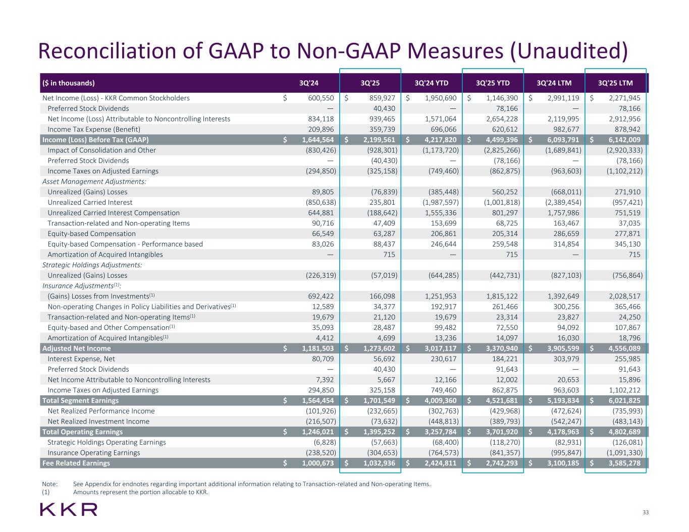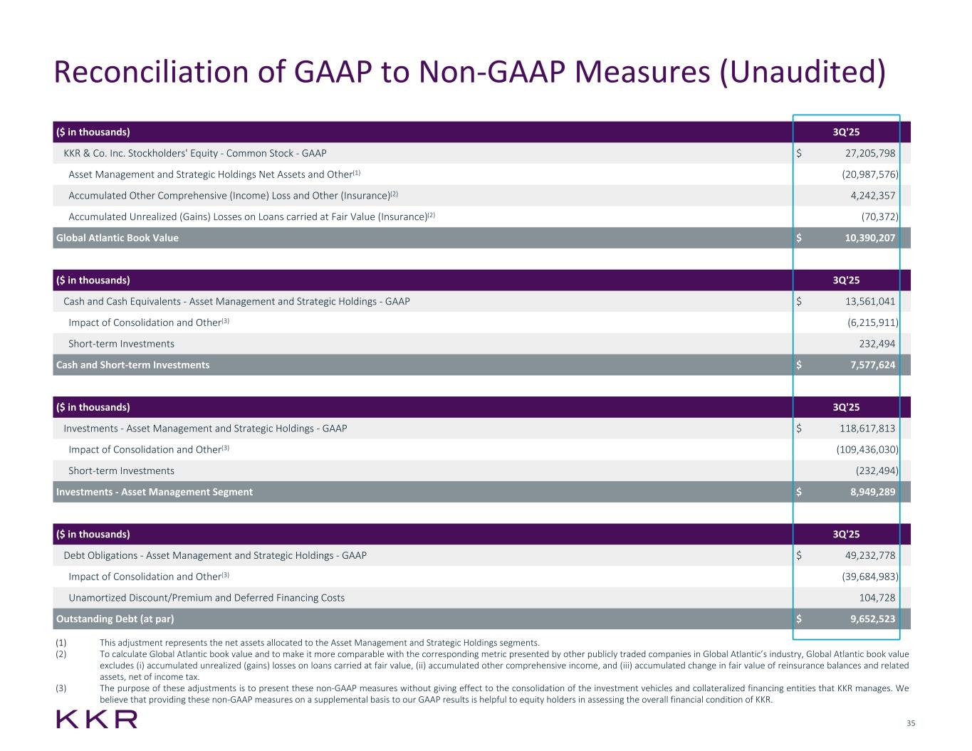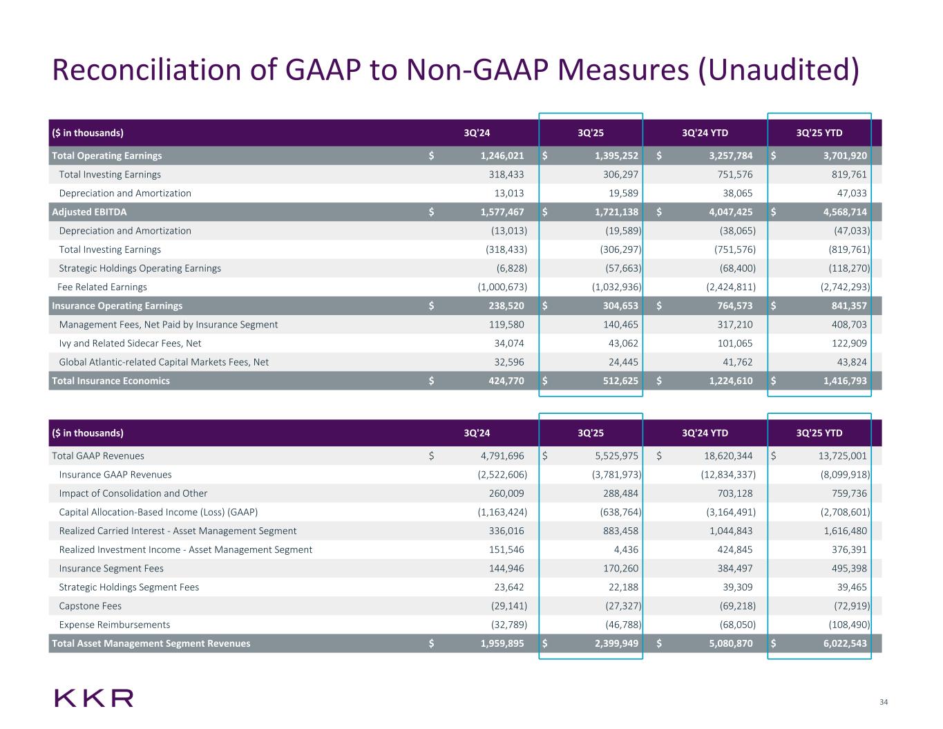 33 Reconciliation of GAAP to Non-GAAP Measures (Unaudited) ($ in thousands) 3Q'24 3Q'25 3Q'24 YTD 3Q'25 YTD 3Q'24 LTM 3Q'25 LTM Net Income (Loss) - KKR Common Stockholders $ 600,550 $ 859,927 $ 1,950,690 $ 1,146,390 $ 2,991,119 $ 2,271,945 Preferred Stock Dividends — 40,430 — 78,166 — 78,166 Net Income (Loss) Attributable to Noncontrolling Interests 834,118 939,465 1,571,064 2,654,228 2,119,995 2,912,956 Income Tax Expense (Benefit) 209,896 359,739 696,066 620,612 982,677 878,942 Income (Loss) Before Tax (GAAP) $ 1,644,564 $ 2,199,561 $ 4,217,820 $ 4,499,396 $ 6,093,791 $ 6,142,009 Impact of Consolidation and Other (830,426) (928,301) (1,173,720) (2,825,266) (1,689,841) (2,920,333) Preferred Stock Dividends — (40,430) — (78,166) — (78,166) Income Taxes on Adjusted Earnings (294,850) (325,158) (749,460) (862,875) (963,603) (1,102,212) Asset Management Adjustments: Unrealized (Gains) Losses 89,805 (76,839) (385,448) 560,252 (668,011) 271,910 Unrealized Carried Interest (850,638) 235,801 (1,987,597) (1,001,818) (2,389,454) (957,421) Unrealized Carried Interest Compensation 644,881 (188,642) 1,555,336 801,297 1,757,986 751,519 Transaction-related and Non-operating Items 90,716 47,409 153,699 68,725 163,467 37,035 Equity-based Compensation 66,549 63,287 206,861 205,314 286,659 277,871 Equity-based Compensation - Performance based 83,026 88,437 246,644 259,548 314,854 345,130 Amortization of Acquired Intangibles — 715 — 715 — 715 Strategic Holdings Adjustments: Unrealized (Gains) Losses (226,319) (57,019) (644,285) (442,731) (827,103) (756,864) Insurance Adjustments(1): (Gains) Losses from Investments(1) 692,422 166,098 1,251,953 1,815,122 1,392,649 2,028,517 Non-operating Changes in Policy Liabilities and Derivatives(1) 12,589 34,377 192,917 261,466 300,256 365,466 Transaction-related and Non-operating Items(1) 19,679 21,120 19,679 23,314 23,827 24,250 Equity-based and Other Compensation(1) 35,093 28,487 99,482 72,550 94,092 107,867 Amortization of Acquired Intangibles(1) 4,412 4,699 13,236 14,097 16,030 18,796 Adjusted Net Income $ 1,181,503 $ 1,273,602 $ 3,017,117 $ 3,370,940 $ 3,905,599 $ 4,556,089 Interest Expense, Net 80,709 56,692 230,617 184,221 303,979 255,985 Preferred Stock Dividends — 40,430 — 91,643 — 91,643 Net Income Attributable to Noncontrolling Interests 7,392 5,667 12,166 12,002 20,653 15,896 Income Taxes on Adjusted Earnings 294,850 325,158 749,460 862,875 963,603 1,102,212 Total Segment Earnings $ 1,564,454 $ 1,701,549 $ 4,009,360 $ 4,521,681 $ 5,193,834 $ 6,021,825 Net Realized Performance Income (101,926) (232,665) (302,763) (429,968) (472,624) (735,993) Net Realized Investment Income (216,507) (73,632) (448,813) (389,793) (542,247) (483,143) Total Operating Earnings $ 1,246,021 $ 1,395,252 $ 3,257,784 $ 3,701,920 $ 4,178,963 $ 4,802,689 Strategic Holdings Operating Earnings (6,828) (57,663) (68,400) (118,270) (82,931) (126,081) Insurance Operating Earnings (238,520) (304,653) (764,573) (841,357) (995,847) (1,091,330) Fee Related Earnings $ 1,000,673 $ 1,032,936 $ 2,424,811 $ 2,742,293 $ 3,100,185 $ 3,585,278 Note: See Appendix for endnotes regarding important additional information relating to Transaction-related and Non-operating Items. (1) Amounts represent the portion allocable to KKR.
