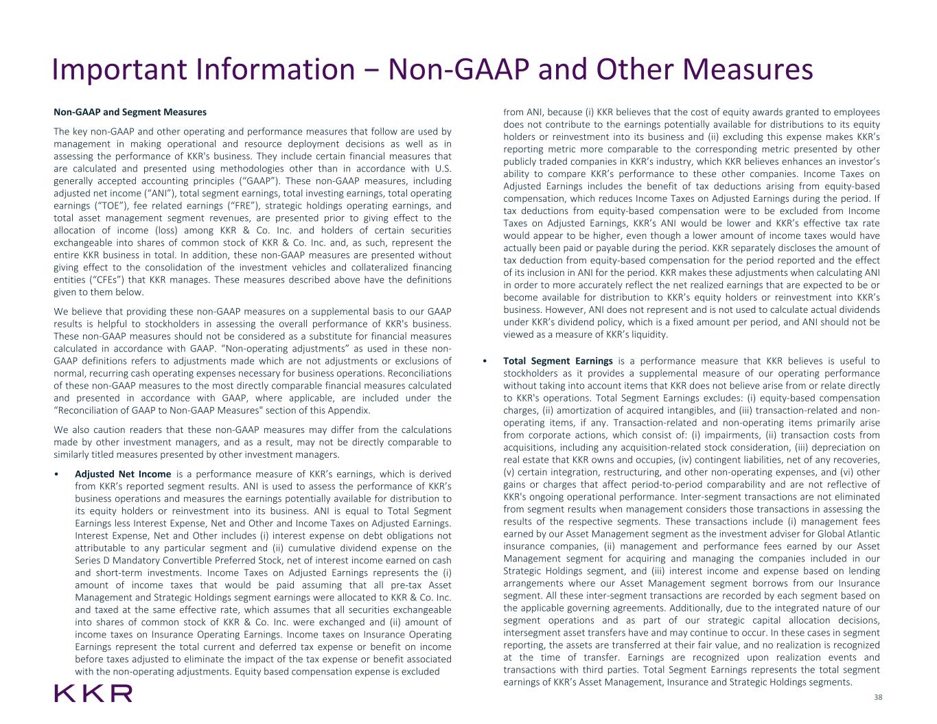 38 Important Information − Non-GAAP and Other Measures from ANI, because (i) KKR believes that the cost of equity awards granted to employees does not contribute to the earnings potentially available for distributions to its equity holders or reinvestment into its business and (ii) excluding this expense makes KKR’s reporting metric more comparable to the corresponding metric presented by other publicly traded companies in KKR’s industry, which KKR believes enhances an investor’s ability to compare KKR’s performance to these other companies. Income Taxes on Adjusted Earnings includes the benefit of tax deductions arising from equity-based compensation, which reduces Income Taxes on Adjusted Earnings during the period. If tax deductions from equity-based compensation were to be excluded from Income Taxes on Adjusted Earnings, KKR’s ANI would be lower and KKR’s effective tax rate would appear to be higher, even though a lower amount of income taxes would have actually been paid or payable during the period. KKR separately discloses the amount of tax deduction from equity-based compensation for the period reported and the effect of its inclusion in ANI for the period. KKR makes these adjustments when calculating ANI in order to more accurately reflect the net realized earnings that are expected to be or become available for distribution to KKR’s equity holders or reinvestment into KKR’s business. However, ANI does not represent and is not used to calculate actual dividends under KKR’s dividend policy, which is a fixed amount per period, and ANI should not be viewed as a measure of KKR’s liquidity. • Total Segment Earnings is a performance measure that KKR believes is useful to stockholders as it provides a supplemental measure of our operating performance without taking into account items that KKR does not believe arise from or relate directly to KKR's operations. Total Segment Earnings excludes: (i) equity-based compensation charges, (ii) amortization of acquired intangibles, and (iii) transaction-related and non- operating items, if any. Transaction-related and non-operating items primarily arise from corporate actions, which consist of: (i) impairments, (ii) transaction costs from acquisitions, including any acquisition-related stock consideration, (iii) depreciation on real estate that KKR owns and occupies, (iv) contingent liabilities, net of any recoveries, (v) certain integration, restructuring, and other non-operating expenses, and (vi) other gains or charges that affect period-to-period comparability and are not reflective of KKR's ongoing operational performance. Inter-segment transactions are not eliminated from segment results when management considers those transactions in assessing the results of the respective segments. These transactions include (i) management fees earned by our Asset Management segment as the investment adviser for Global Atlantic insurance companies, (ii) management and performance fees earned by our Asset Management segment for acquiring and managing the companies included in our Strategic Holdings segment, and (iii) interest income and expense based on lending arrangements where our Asset Management segment borrows from our Insurance segment. All these inter-segment transactions are recorded by each segment based on the applicable governing agreements. Additionally, due to the integrated nature of our segment operations and as part of our strategic capital allocation decisions, intersegment asset transfers have and may continue to occur. In these cases in segment reporting, the assets are transferred at their fair value, and no realization is recognized at the time of transfer. Earnings are recognized upon realization events and transactions with third parties. Total Segment Earnings represents the total segment earnings of KKR’s Asset Management, Insurance and Strategic Holdings segments. Non-GAAP and Segment Measures The key non-GAAP and other operating and performance measures that follow are used by management in making operational and resource deployment decisions as well as in assessing the performance of KKR's business. They include certain financial measures that are calculated and presented using methodologies other than in accordance with U.S. generally accepted accounting principles (“GAAP”). These non-GAAP measures, including adjusted net income (“ANI”), total segment earnings, total investing earnings, total operating earnings (“TOE”), fee related earnings (“FRE”), strategic holdings operating earnings, and total asset management segment revenues, are presented prior to giving effect to the allocation of income (loss) among KKR & Co. Inc. and holders of certain securities exchangeable into shares of common stock of KKR & Co. Inc. and, as such, represent the entire KKR business in total. In addition, these non-GAAP measures are presented without giving effect to the consolidation of the investment vehicles and collateralized financing entities (“CFEs”) that KKR manages. These measures described above have the definitions given to them below. We believe that providing these non-GAAP measures on a supplemental basis to our GAAP results is helpful to stockholders in assessing the overall performance of KKR's business. These non-GAAP measures should not be considered as a substitute for financial measures calculated in accordance with GAAP. “Non-operating adjustments” as used in these non- GAAP definitions refers to adjustments made which are not adjustments or exclusions of normal, recurring cash operating expenses necessary for business operations. Reconciliations of these non-GAAP measures to the most directly comparable financial measures calculated and presented in accordance with GAAP, where applicable, are included under the “Reconciliation of GAAP to Non-GAAP Measures" section of this Appendix. We also caution readers that these non-GAAP measures may differ from the calculations made by 