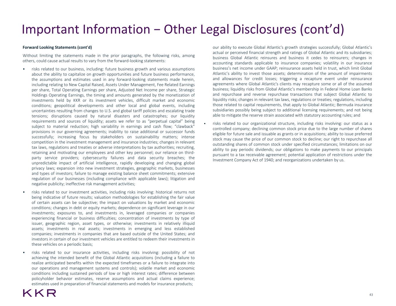43 our ability to execute Global Atlantic's growth strategies successfully; Global Atlantic’s actual or perceived financial strength and ratings of Global Atlantic and its subsidiaries; business Global Atlantic reinsures and business it cedes to reinsurers; changes in accounting standards applicable to insurance companies; volatility in our insurance business’s net income under GAAP; reinsurance assets held in trust, which limit Global Atlantic’s ability to invest those assets; determination of the amount of impairments and allowances for credit losses; triggering a recapture event under reinsurance agreements where Global Atlantic's clients may recapture some or all of the assumed business; liquidity risks from Global Atlantic’s membership in Federal Home Loan Banks and repurchase and reverse repurchase transactions that subject Global Atlantic to liquidity risks; changes in relevant tax laws, regulations or treaties; regulations, including those related to capital requirements, that apply to Global Atlantic; Bermuda insurance subsidiaries possibly being subject to additional licensing requirements; and not being able to mitigate the reserve strain associated with statutory accounting rules; and • risks related to our organizational structure, including risks involving: our status as a controlled company; declining common stock price due to the large number of shares eligible for future sale and issuable as grants or in acquisitions; ability to issue preferred stock may cause the price of our common stock to decline; our right to repurchase all outstanding shares of common stock under specified circumstances; limitations on our ability to pay periodic dividends; our obligations to make payments to our principals pursuant to a tax receivable agreement; potential application of restrictions under the Investment Company Act of 1940; and reorganizations undertaken by us. Forward Looking Statements (cont'd) Without limiting the statements made in the prior paragraphs, the following risks, among others, could cause actual results to vary from the forward-looking statements: • risks related to our business, including: future business growth and various assumptions about the ability to capitalize on growth opportunities and future business performance, the assumptions and estimates used in any forward-looking statements made herein, including relating to New Capital Raised, Assets Under Management, Fee Related Earnings per share, Total Operating Earnings per share, Adjusted Net Income per share, Strategic Holdings Operating Earnings, the timing and amounts generated by the monetization of investments held by KKR or its investment vehicles, difficult market and economic conditions; geopolitical developments and other local and global events, including uncertainties resulting from changes to U.S. and global tariff policies and escalating trade tensions; disruptions caused by natural disasters and catastrophes; our liquidity requirements and sources of liquidity; assets we refer to as “perpetual capital” being subject to material reduction; high variability in earnings and cash flow; “clawback” provisions in our governing agreements; inability to raise additional or successor funds successfully; increasing focus by stakeholders on sustainability matters; intense competition in the investment management and insurance industries; changes in relevant tax laws, regulations and treaties or adverse interpretations by tax authorities; recruiting, retaining and motivating our employees and other key personnel; our reliance on third- party service providers; cybersecurity failures and data security breaches; the unpredictable impact of artificial intelligence, rapidly developing and changing global privacy laws; expansion into new investment strategies, geographic markets, businesses and types of investors; failure to manage existing balance sheet commitments; extensive regulation of our businesses (including compliance with applicable laws); litigation and negative publicity; ineffective risk management activities; • risks related to our investment activities, including risks involving: historical returns not being indicative of future results; valuation methodologies for establishing the fair value of certain assets can be subjective; the impact on valuations by market and economic conditions; changes in debt or equity markets; dependence on significant leverage in our investments; exposures to, and investments in, leveraged companies or companies experiencing financial or business difficulties; concentration of investments by type of issuer, geographic region, asset types, or otherwise; investments in relatively illiquid assets; investments in real assets; investments in emerging and less established companies; investments in companies that are based outside of the United States; and investors in certain of our investment vehicles are entitled to redeem their investments in these vehicles on a periodic basis; • risks related to our insurance activities, including risks involving: possibility of not achieving the intended benefit of the Global Atlantic acquisitions (including a failure to realize anticipated benefits within the expected timeframes or a failure to integrate into our operations and management systems and controls); volatile market and economic conditions including sustained periods of low or high interest rates; difference between policyholder behavior estimates, reserve assumptions and actual claims experience; estimates used in preparation of financial statements and models for insurance products; Important Information − Other Legal Disclosures (cont’d)