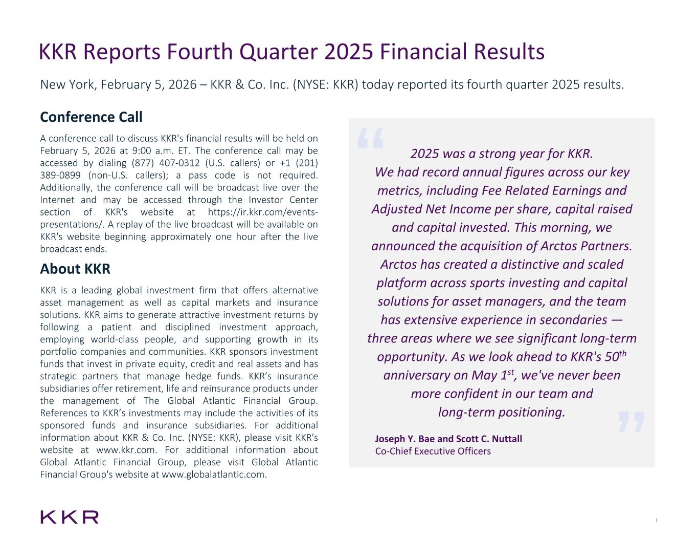 i 2025 was a strong year for KKR. We had record annual figures across our key metrics, including Fee Related Earnings and Adjusted Net Income per share, capital raised and capital invested. This morning, we announced the acquisition of Arctos Partners. Arctos has created a distinctive and scaled platform across sports investing and capital solutions for asset managers, and the team has extensive experience in secondaries — three areas where we see significant long-term opportunity. As we look ahead to KKR's 50th anniversary on May 1st, we've never been more confident in our team and long-term positioning. Conference Call A conference call to discuss KKR's financial results will be held on February 5, 2026 at 9:00 a.m. ET. The conference call may be accessed by dialing (877) 407-0312 (U.S. callers) or +1 (201) 389-0899 (non-U.S. callers); a pass code is not required. Additionally, the conference call will be broadcast live over the Internet and may be accessed through the Investor Center section of KKR's website at https://ir.kkr.com/events- presentations/. A replay of the live broadcast will be available on KKR's website beginning approximately one hour after the live broadcast ends. About KKR KKR is a leading global investment firm that offers alternative asset management as well as capital markets and insurance solutions. KKR aims to generate attractive investment returns by following a patient and disciplined investment approach, employing world-class people, and supporting growth in its portfolio companies and communities. KKR sponsors investment funds that invest in private equity, credit and real assets and has strategic partners that manage hedge funds. KKR’s insurance subsidiaries offer retirement, life and reinsurance products under the management of The Global Atlantic Financial Group. References to KKR’s investments may include the activities of its sponsored funds and insurance subsidiaries. For additional information about KKR & Co. Inc. (NYSE: KKR), please visit KKR's website at www.kkr.com. For additional information about Global Atlantic Financial Group, please visit Global Atlantic Financial Group's website at www.globalatlantic.com. New York, February 5, 2026 – KKR & Co. Inc. (NYSE: KKR) today reported its fourth quarter 2025 results. KKR Reports Fourth Quarter 2025 Financial Results Joseph Y. Bae and Scott C. Nuttall Co-Chief Executive Officers