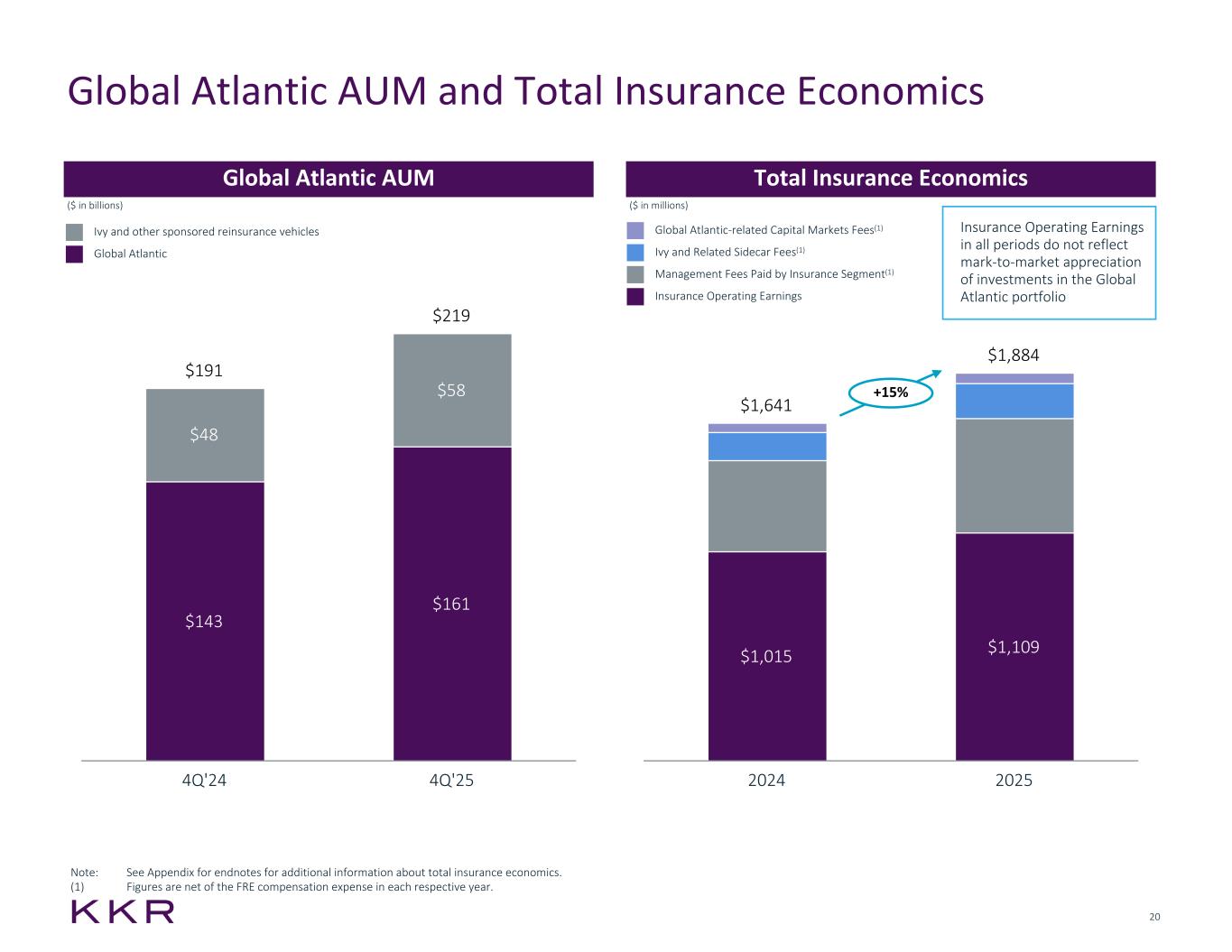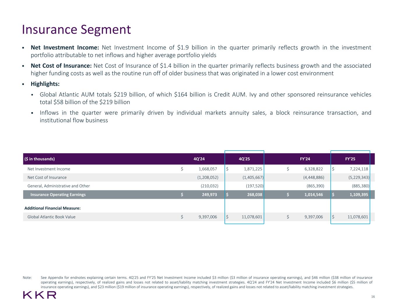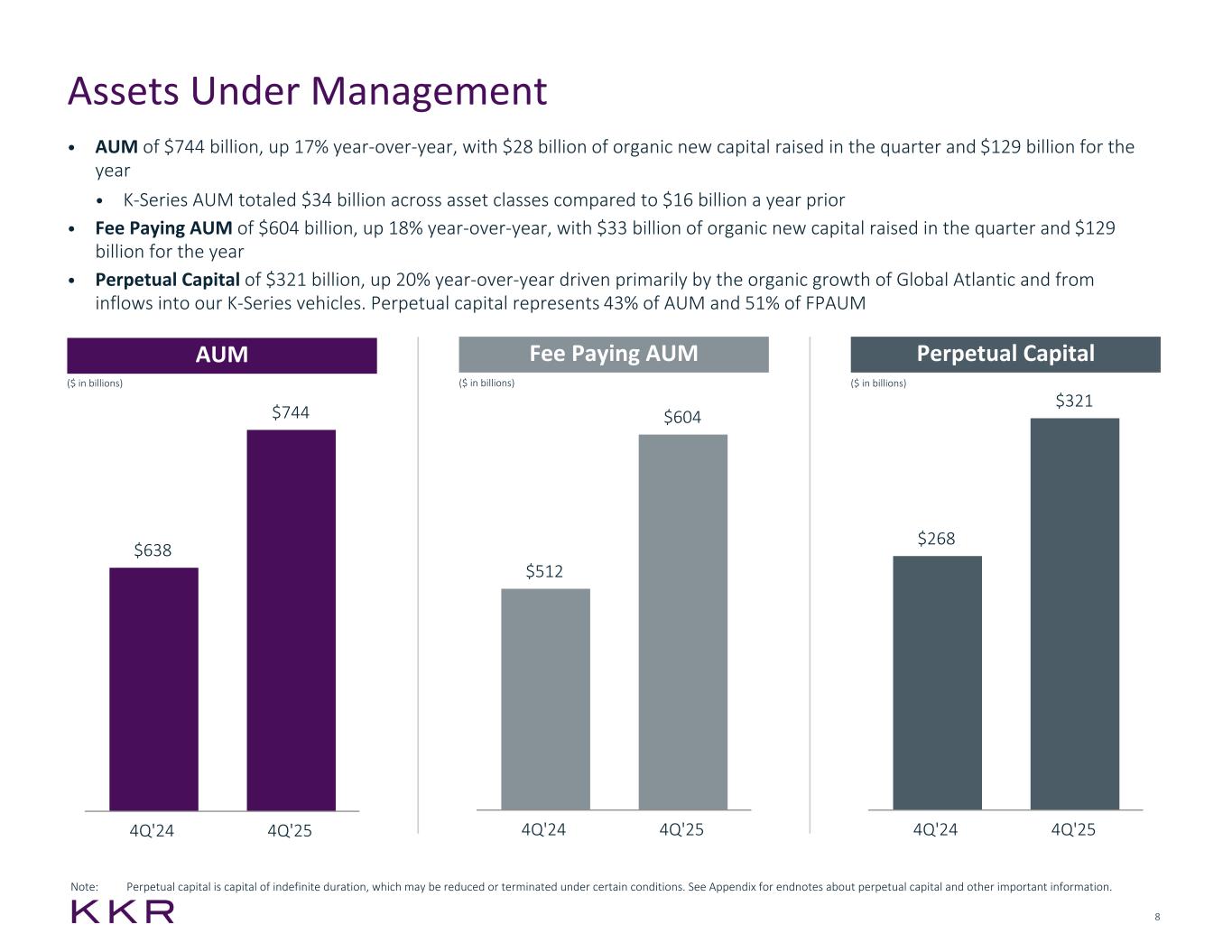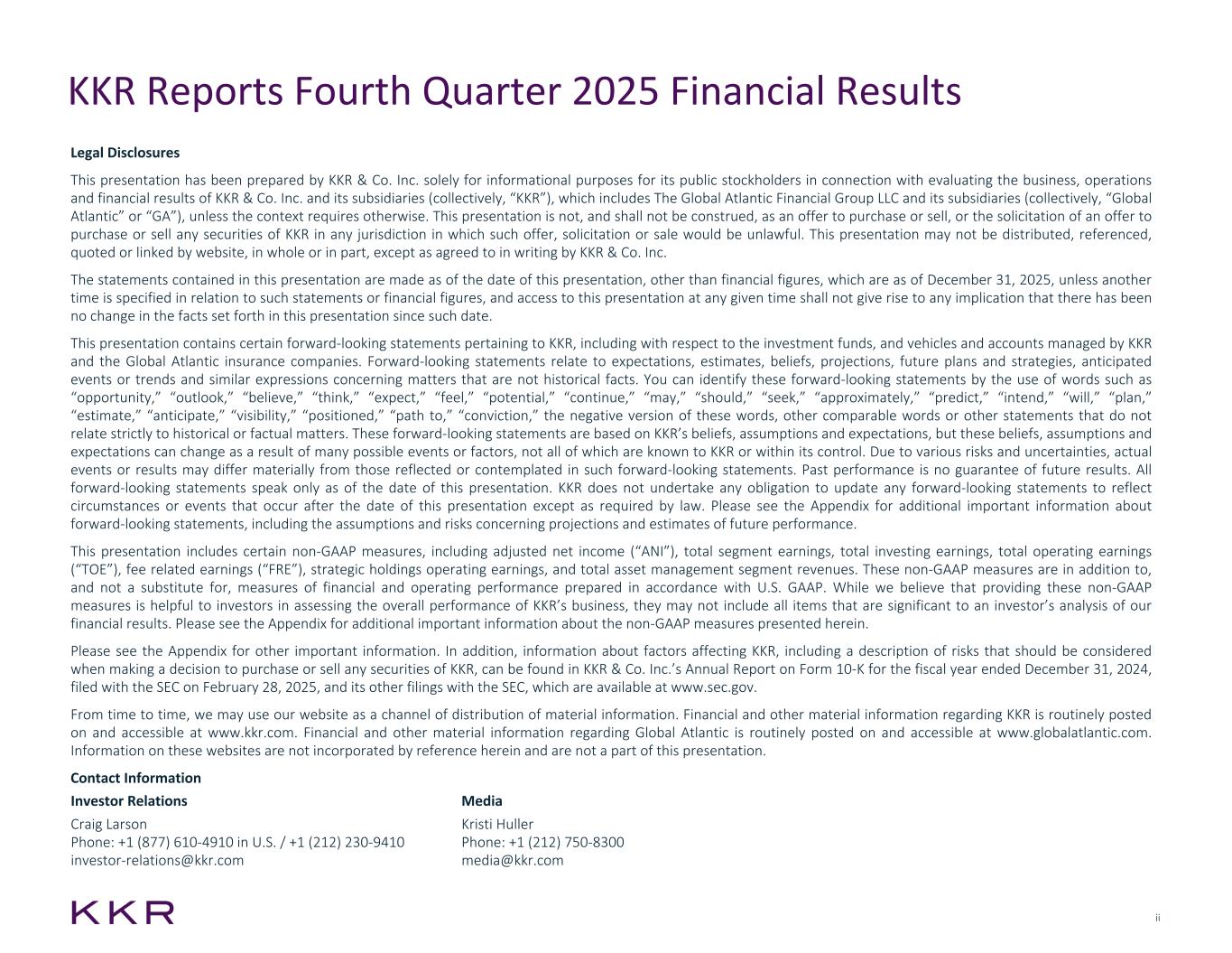 ii KKR Reports Fourth Quarter 2025 Financial Results Investor Relations Craig Larson Phone: +1 (877) 610-4910 in U.S. / +1 (212) 230-9410 investor-relations@kkr.com Media Kristi Huller Phone: +1 (212) 750-8300 media@kkr.com Legal Disclosures This presentation has been prepared by KKR & Co. Inc. solely for informational purposes for its public stockholders in connection with evaluating the business, operations and financial results of KKR & Co. Inc. and its subsidiaries (collectively, “KKR”), which includes The Global Atlantic Financial Group LLC and its subsidiaries (collectively, “Global Atlantic” or “GA”), unless the context requires otherwise. This presentation is not, and shall not be construed, as an offer to purchase or sell, or the solicitation of an offer to purchase or sell any securities of KKR in any jurisdiction in which such offer, solicitation or sale would be unlawful. This presentation may not be distributed, referenced, quoted or linked by website, in whole or in part, except as agreed to in writing by KKR & Co. Inc. The statements contained in this presentation are made as of the date of this presentation, other than financial figures, which are as of December 31, 2025, unless another time is specified in relation to such statements or financial figures, and access to this presentation at any given time shall not give rise to any implication that there has been no change in the facts set forth in this presentation since such date. This presentation contains certain forward-looking statements pertaining to KKR, including with respect to the investment funds, and vehicles and accounts managed by KKR and the Global Atlantic insurance companies. Forward-looking statements relate to expectations, estimates, beliefs, projections, future plans and strategies, anticipated events or trends and similar expressions concerning matters that are not historical facts. You can identify these forward-looking statements by the use of words such as “opportunity,” “outlook,” “believe,” “think,” “expect,” “feel,” “potential,” “continue,” “may,” “should,” “seek,” “approximately,” “predict,” “intend,” “will,” “plan,” “estimate,” “anticipate,” “visibility,” “positioned,” “path to,” “conviction,” the negative version of these words, other comparable words or other statements that do not relate strictly to historical or factual matters. These forward-looking statements are based on KKR’s beliefs, assumptions and expectations, but these beliefs, assumptions and expectations can change as a result of many possible events or factors, not all of which are known to KKR or within its control. Due to various risks and uncertainties, actual events or results may differ materially from those reflected or contemplated in such forward-looking statements. Past performance is no guarantee of future results. All forward-looking statements speak only as of the date of this presentation. KKR does not undertake any obligation to update any forward-looking statements to reflect circumstances or events that occur after the date of this presentation except as required by law. Please see the Appendix for additional important information about forward-looking statements, including the assumptions and risks concerning projections and estimates of future performance. This presentation includes certain non-GAAP measures, including adjusted net income (“ANI”), total segment earnings, total investing earnings, total operating earnings (“TOE”), fee related earnings (“FRE”), strategic holdings operating earnings, and total asset management segment revenues. These non-GAAP measures are in addition to, and not a substitute for, measures of financial and operating performance prepared in accordance with U.S. GAAP. While we believe that providing these non-GAAP measures is helpful to investors in assessing the overall performance of KKR’s business, they may not include all items that are significant to an investor’s analysis of our financial results. Please see the Appendix for additional important information about the non-GAAP measures presented herein. Please see the Appendix for other important information. In addition, information about factors affecting KKR, including a description of risks that should be considered when making a decision to purchase or sell any securities of KKR, can be found in KKR & Co. Inc.’s Annual Report on Form 10-K for the fiscal year ended December 31, 2024, filed with the SEC on February 28, 2025, and its other filings with the SEC, which are available at www.sec.gov. From time to time, we may use our website as a channel of distribution of material information. Financial and other material information regarding KKR is routinely posted on and accessible at www.kkr.com. Financial and other material information regarding Global Atlantic is routinely posted on and accessible at www.globalatlantic.com. Information on these websites are not incorporated by reference herein and are not a part of this presentation. Contact Information
