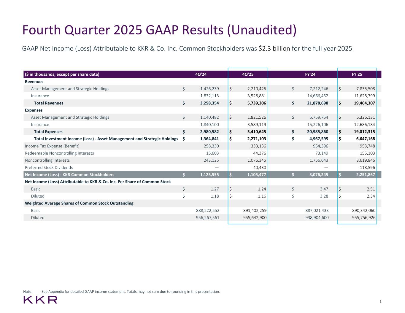 1 Fourth Quarter 2025 GAAP Results (Unaudited) GAAP Net Income (Loss) Attributable to KKR & Co. Inc. Common Stockholders was $2.3 billion for the full year 2025 ($ in thousands, except per share data) 4Q'24 4Q'25 FY'24 FY'25 Revenues Asset Management and Strategic Holdings $ 1,426,239 $ 2,210,425 $ 7,212,246 $ 7,835,508 Insurance 1,832,115 3,528,881 14,666,452 11,628,799 Total Revenues $ 3,258,354 $ 5,739,306 $ 21,878,698 $ 19,464,307 Expenses Asset Management and Strategic Holdings $ 1,140,482 $ 1,821,526 $ 5,759,754 $ 6,326,131 Insurance 1,840,100 3,589,119 15,226,106 12,686,184 Total Expenses $ 2,980,582 $ 5,410,645 $ 20,985,860 $ 19,012,315 Total Investment Income (Loss) - Asset Management and Strategic Holdings $ 1,364,841 $ 2,271,103 $ 4,967,595 $ 6,647,168 Income Tax Expense (Benefit) 258,330 333,136 954,396 953,748 Redeemable Noncontrolling Interests 15,603 44,376 73,149 155,103 Noncontrolling Interests 243,125 1,076,345 1,756,643 3,619,846 Preferred Stock Dividends — 40,430 — 118,596 Net Income (Loss) - KKR Common Stockholders $ 1,125,555 $ 1,105,477 $ 3,076,245 $ 2,251,867 Net Income (Loss) Attributable to KKR & Co. Inc. Per Share of Common Stock Basic $ 1.27 $ 1.24 $ 3.47 $ 2.51 Diluted $ 1.18 $ 1.16 $ 3.28 $ 2.34 Weighted Average Shares of Common Stock Outstanding Basic 888,222,552 891,402,259 887,021,433 890,342,060 Diluted 956,267,561 955,642,900 938,904,600 955,756,926 Note: See Appendix for detailed GAAP income statement. Totals may not sum due to rounding in this presentation.