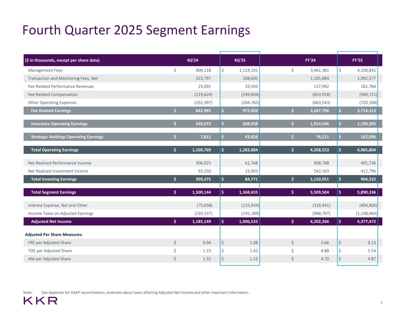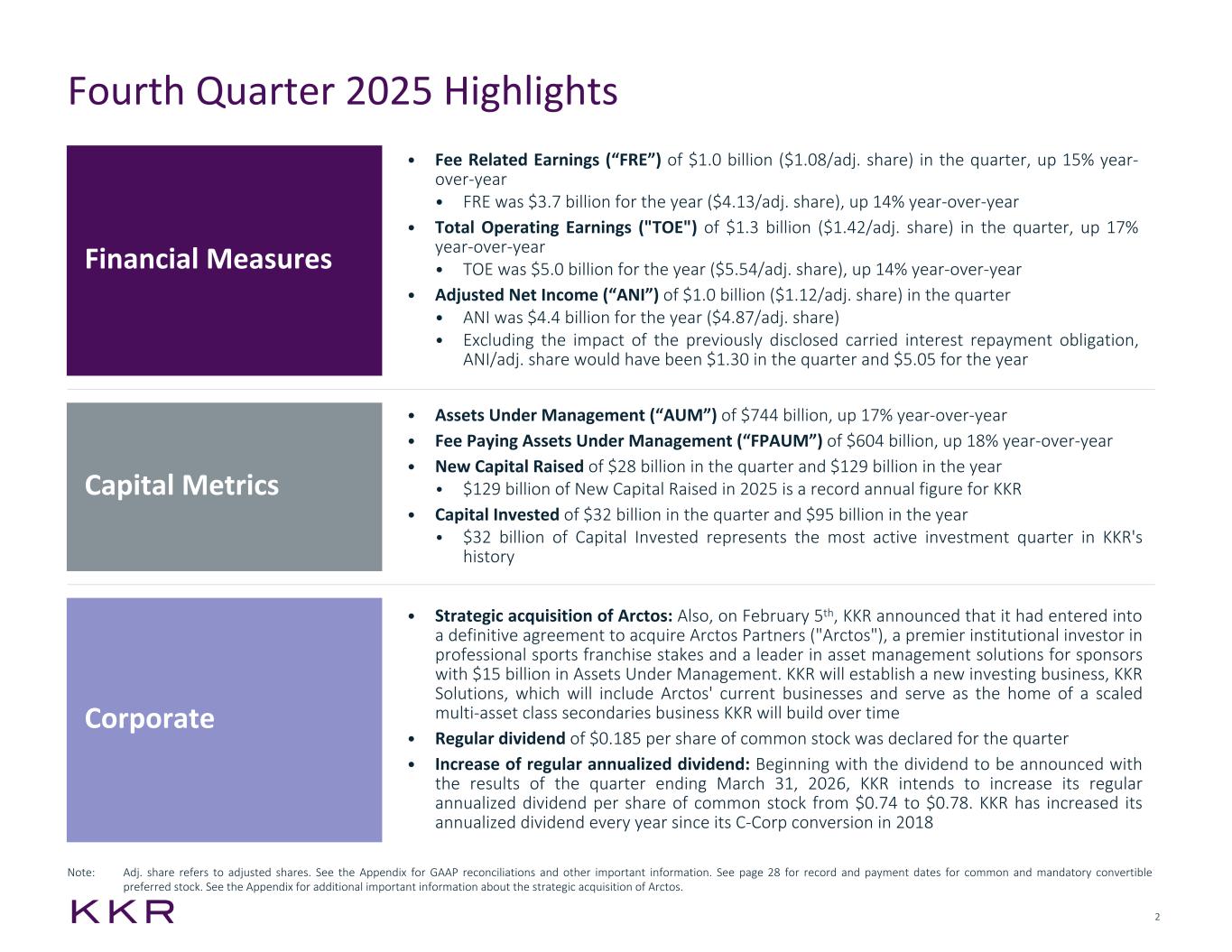 2 • Strategic acquisition of Arctos: Also, on February 5th, KKR announced that it had entered into a definitive agreement to acquire Arctos Partners ("Arctos"), a premier institutional investor in professional sports franchise stakes and a leader in asset management solutions for sponsors with $15 billion in Assets Under Management. KKR will establish a new investing business, KKR Solutions, which will include Arctos' current businesses and serve as the home of a scaled multi-asset class secondaries business KKR will build over time • Regular dividend of $0.185 per share of common stock was declared for the quarter • Increase of regular annualized dividend: Beginning with the dividend to be announced with the results of the quarter ending March 31, 2026, KKR intends to increase its regular annualized dividend per share of common stock from $0.74 to $0.78. KKR has increased its annualized dividend every year since its C-Corp conversion in 2018 Capital Metrics Fourth Quarter 2025 Highlights • Fee Related Earnings (“FRE”) of $1.0 billion ($1.08/adj. share) in the quarter, up 15% year- over-year • FRE was $3.7 billion for the year ($4.13/adj. share), up 14% year-over-year • Total Operating Earnings ("TOE") of $1.3 billion ($1.42/adj. share) in the quarter, up 17% year-over-year • TOE was $5.0 billion for the year ($5.54/adj. share), up 14% year-over-year • Adjusted Net Income (“ANI”) of $1.0 billion ($1.12/adj. share) in the quarter • ANI was $4.4 billion for the year ($4.87/adj. share) • Excluding the impact of the previously disclosed carried interest repayment obligation, ANI/adj. share would have been $1.30 in the quarter and $5.05 for the year • Assets Under Management (“AUM”) of $744 billion, up 17% year-over-year • Fee Paying Assets Under Management (“FPAUM”) of $604 billion, up 18% year-over-year • New Capital Raised of $28 billion in the quarter and $129 billion in the year • $129 billion of New Capital Raised in 2025 is a record annual figure for KKR • Capital Invested of $32 billion in the quarter and $95 billion in the year • $32 billion of Capital Invested represents the most active investment quarter in KKR's history Note: Adj. share refers to adjusted shares. See the Appendix for GAAP reconciliations and other important information. See page 28 for record and payment dates for common and mandatory convertible preferred stock. See the Appendix for additional important information about the strategic acquisition of Arctos. Financial Measures Corporate