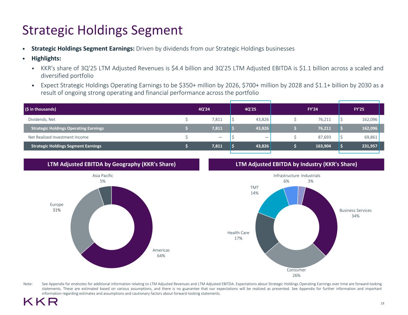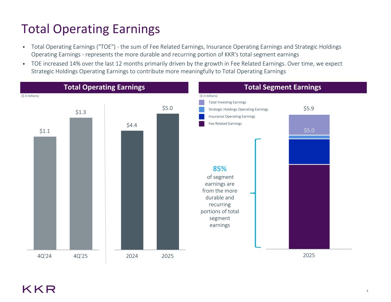 4 $4.4 $5.0 2024 2025 Total Operating Earnings ($ in billions) Total Operating Earnings • Total Operating Earnings ("TOE") - the sum of Fee Related Earnings, Insurance Operating Earnings and Strategic Holdings Operating Earnings - represents the more durable and recurring portion of KKR's total segment earnings • TOE increased 14% over the last 12 months primarily driven by the growth in Fee Related Earnings. Over time, we expect Strategic Holdings Operating Earnings to contribute more meaningfully to Total Operating Earnings $1.1 $1.3 4Q'24 4Q'25 Total Segment Earnings $5.9 2025 ($ in billions) Insurance Operating Earnings Fee Related Earnings Total Investing Earnings Strategic Holdings Operating Earnings $5.0 85% of segment earnings are from the more durable and recurring portions of total segment earnings