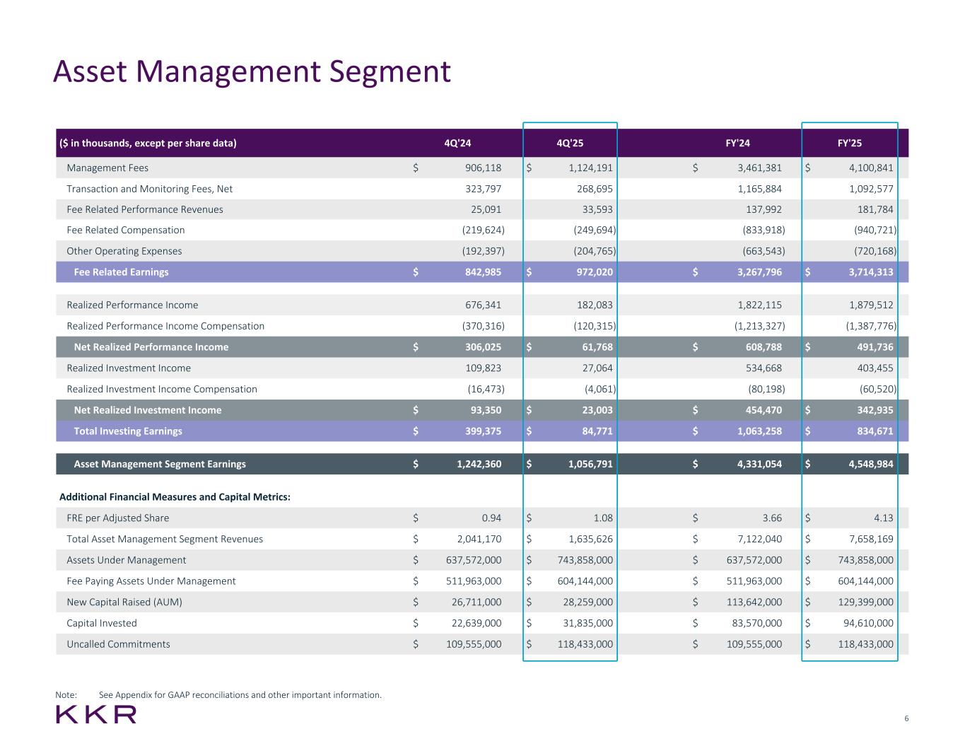 3 Fourth Quarter 2025 Segment Earnings Note: See Appendix for GAAP reconciliations, endnotes about taxes affecting Adjusted Net Income and other important information. ($ in thousands, except per share data) 4Q'24 4Q'25 FY'24 FY'25 Management Fees $ 906,118 $ 1,124,191 $ 3,461,381 $ 4,100,841 Transaction and Monitoring Fees, Net 323,797 268,695 1,165,884 1,092,577 Fee Related Performance Revenues 25,091 33,593 137,992 181,784 Fee Related Compensation (219,624) (249,694) (833,918) (940,721) Other Operating Expenses (192,397) (204,765) (663,543) (720,168) Fee Related Earnings $ 842,985 $ 972,020 $ 3,267,796 $ 3,714,313 Insurance Operating Earnings $ 249,973 $ 268,038 $ 1,014,546 $ 1,109,395 Strategic Holdings Operating Earnings $ 7,811 $ 43,826 $ 76,211 $ 162,096 Total Operating Earnings $ 1,100,769 $ 1,283,884 $ 4,358,553 $ 4,985,804 Net Realized Performance Income 306,025 61,768 608,788 491,736 Net Realized Investment Income 93,350 23,003 542,163 412,796 Total Investing Earnings $ 399,375 $ 84,771 $ 1,150,951 $ 904,532 Total Segment Earnings $ 1,500,144 $ 1,368,655 $ 5,509,504 $ 5,890,336 Interest Expense, Net and Other (75,658) (116,934) (318,441) (404,800) Income Taxes on Adjusted Earnings (239,337) (245,189) (988,797) (1,108,064) Adjusted Net Income $ 1,185,149 $ 1,006,532 $ 4,202,266 $ 4,377,472 Adjusted Per Share Measures: FRE per Adjusted Share $ 0.94 $ 1.08 $ 3.66 $ 4.13 TOE per Adjusted Share $ 1.23 $ 1.42 $ 4.88 $ 5.54 ANI per Adjusted Share $ 1.32 $ 1.12 $ 4.70 $ 4.87